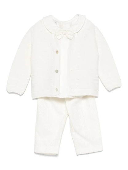 بدلة بيضاء للأولاد من ماركة PAZ RODRIGUEZ . طقم مكون من 3 قطع: كارديجان وقميص وبنطلون طويل، كلهم باللون الأبيض، 100% قطن. ملابس بتفاصيل، وسترة صوفية بأكمام طويلة، هيكل محبوك، تصميم مطرز، ياقة على شكل حرف V، زر للإغلاق في الأمام، قميص بأكمام طويلة ، إغلاق بوتوبي في الخلف، مريح وراقي، برقبة دائرية، بنطال طويل من قماش الجاكار، مستقيم، مع حزام خصر مرن، حاشية مستقيمة . مثالية لأية مناسبة الخريف والشتاء. قماش عالي الجودة بتصميم رسمي أنيق.