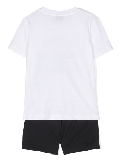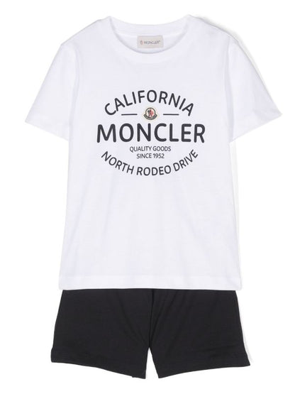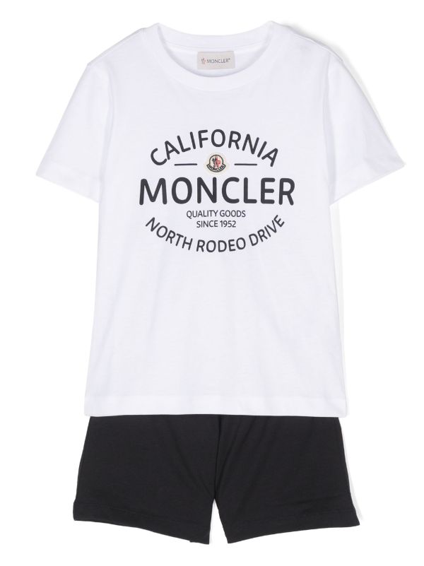 طقم - بدلة رياضية مكونة من تي شيرت أبيض وشورت برمودا أسود مع رقعة شعار MONCLER. تي شيرت باللونين الأبيض والأسود، 100% قطن، مطبوع عليه شعار مونكلر على الجهة الأمامية، رقعة شعار على الصدر، أكمام قصيرة، رقبة دائرية، حاشية مستقيمة، شورت برمودا مع علامة شعار صغيرة في الخلف، حزام خصر مطاطي، جيبان جانبيان مائلان . ملابس من العلامة التجارية MONCLER هو تصميم أصلي يمكن التعرف عليه في جميع أنحاء العالم.