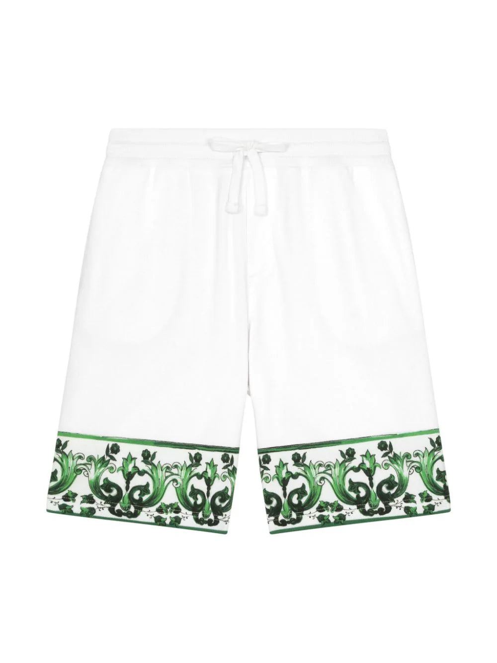 برمودا مع طبعة Majolica من علامة Dolce & Gabbana Kids التجارية. اللون الأبيض و أخضر، قطن، تصميم لوحة، طباعة ماجوليكا، حزام خصر مطاطي، رباط للإغلاق عند الخصر، جيب رقعة في الخلف، حاشية مستقيمة. تعكس ملابس الأطفال من العلامة التجارية الشهيرة عالميًا Dolce & Gabbana Kids اتجاهات الموضة للبالغين، ولكنها في نفس الوقت تحافظ على أقصى درجات الراحة والجودة والتصميم الحصري والأسلوب المميز.