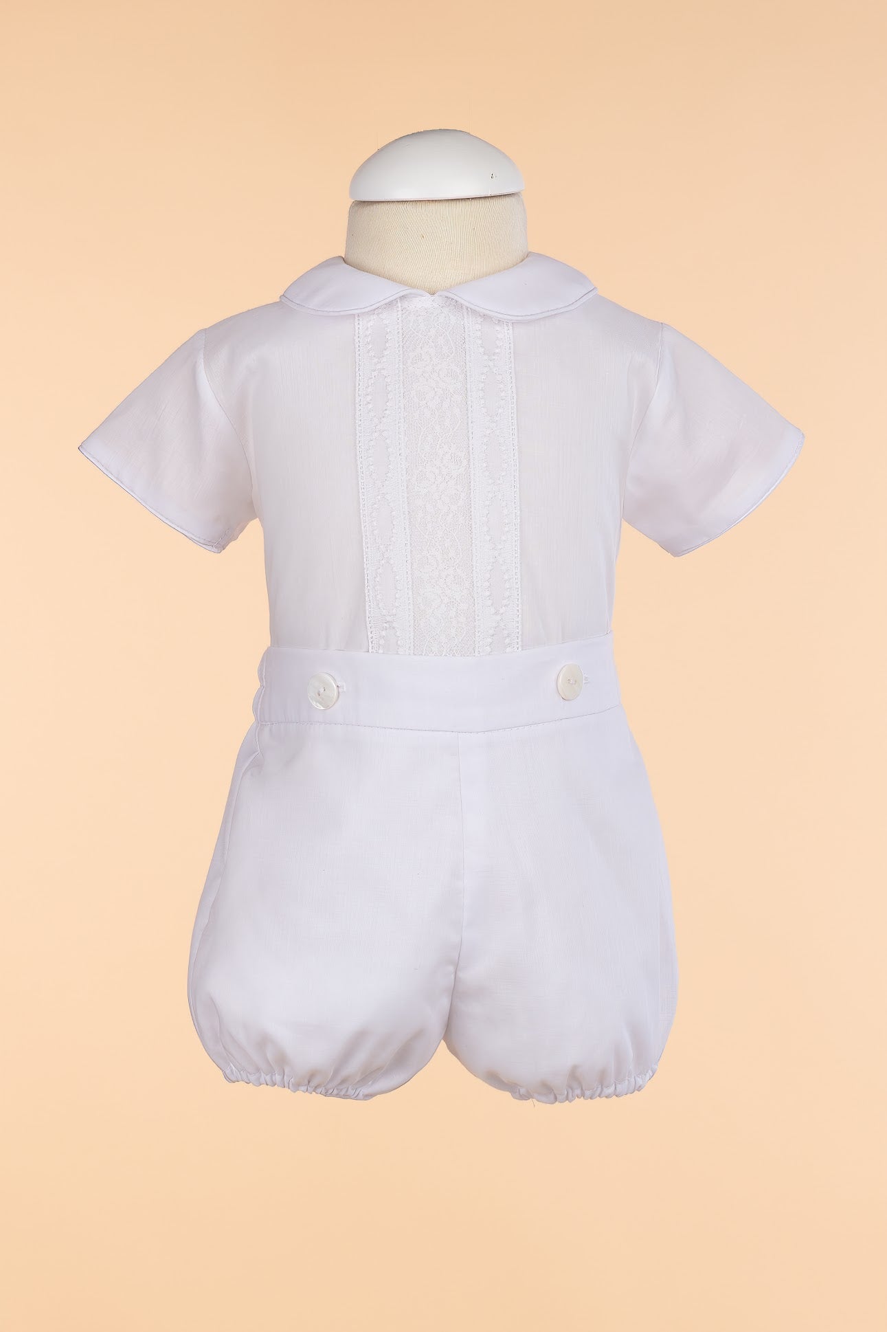 طقم تعميد للأطفال باللون البيج، مريح وخفيف. طقم قميص وشورت بأكمام قصيرة، مزين بالدانتيل من الأمام.