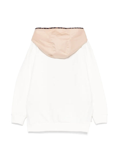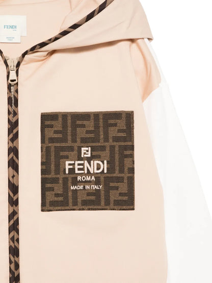 بلوزة من قماش الغبردين المطاطي للأطفال من ماركة Fendi Kids. بيج، قطن مطاطي، مخمل، شعار FF مطبوع. بلوزة أطفال بغطاء رأس وسحاب من قماش الغبردين المطاطي باللونين البيج والأبيض مع جيب من قماش الجاكار مع شعار FF بلون التبغ مطبق على الجهة الأمامية. بأكمام طويلة ورقبة دائرية وأساور مرنة وحاشية مستقيمة. تتمتع Fendi Kids بطباعة علامة تجارية معروفة، تحظى بشعبية في جميع أنحاء العالم. تكرر مجموعات الأطفال نماذج الكبار، وتجمع بين الفخامة والراحة.
