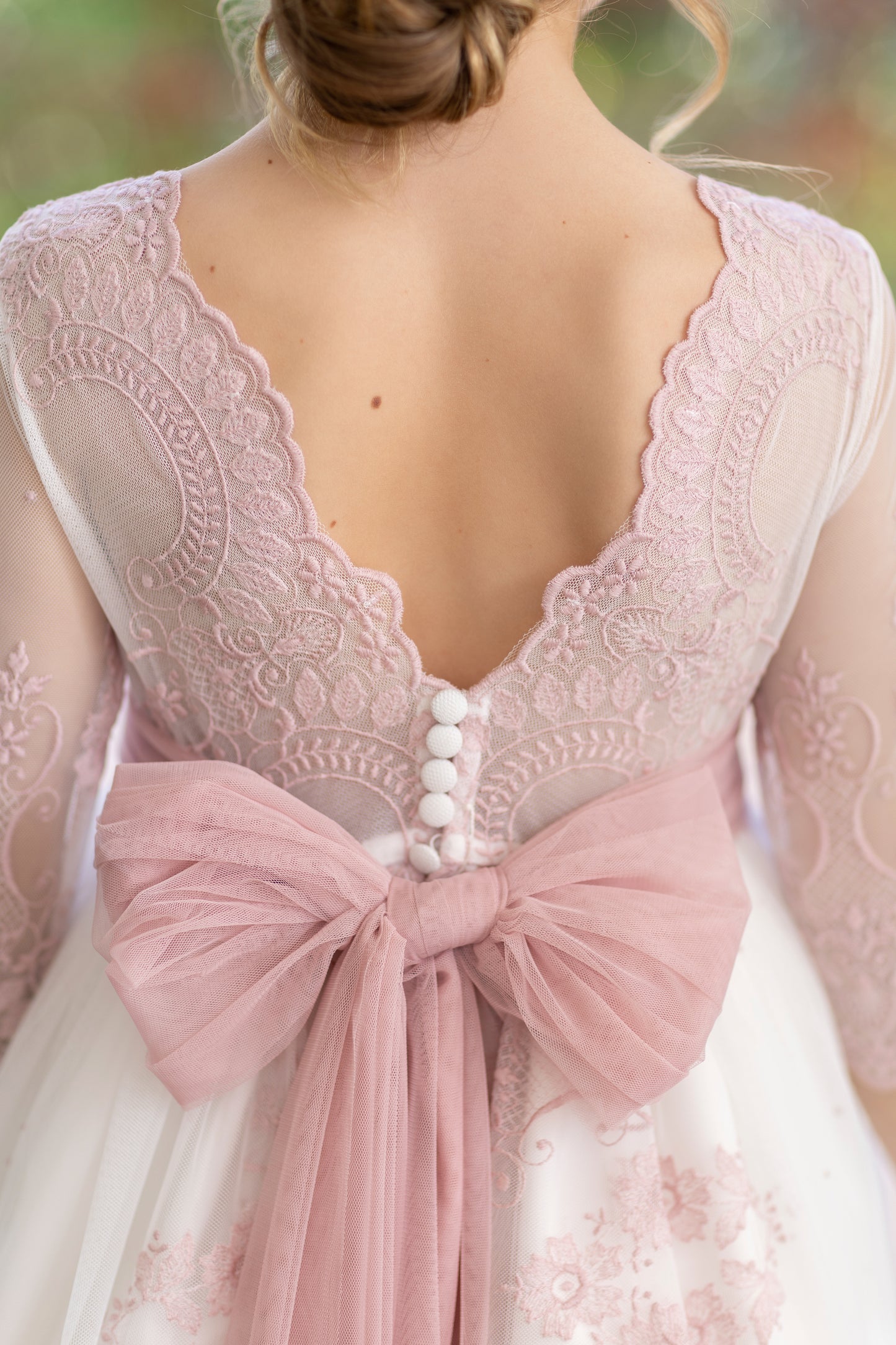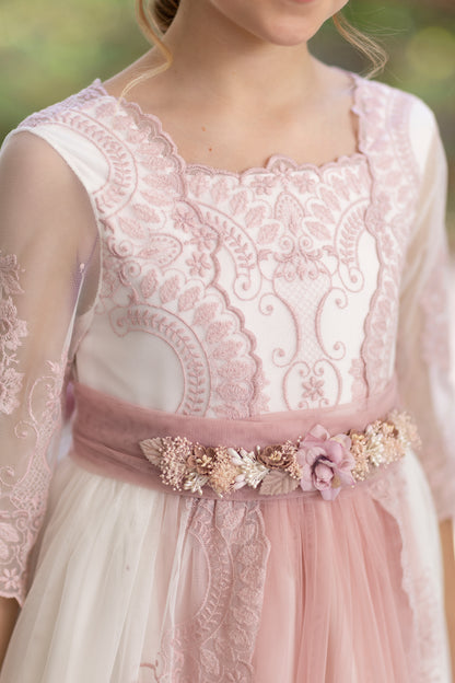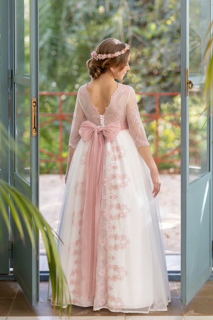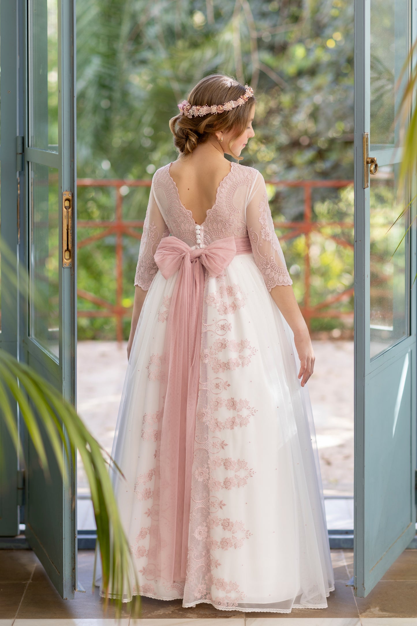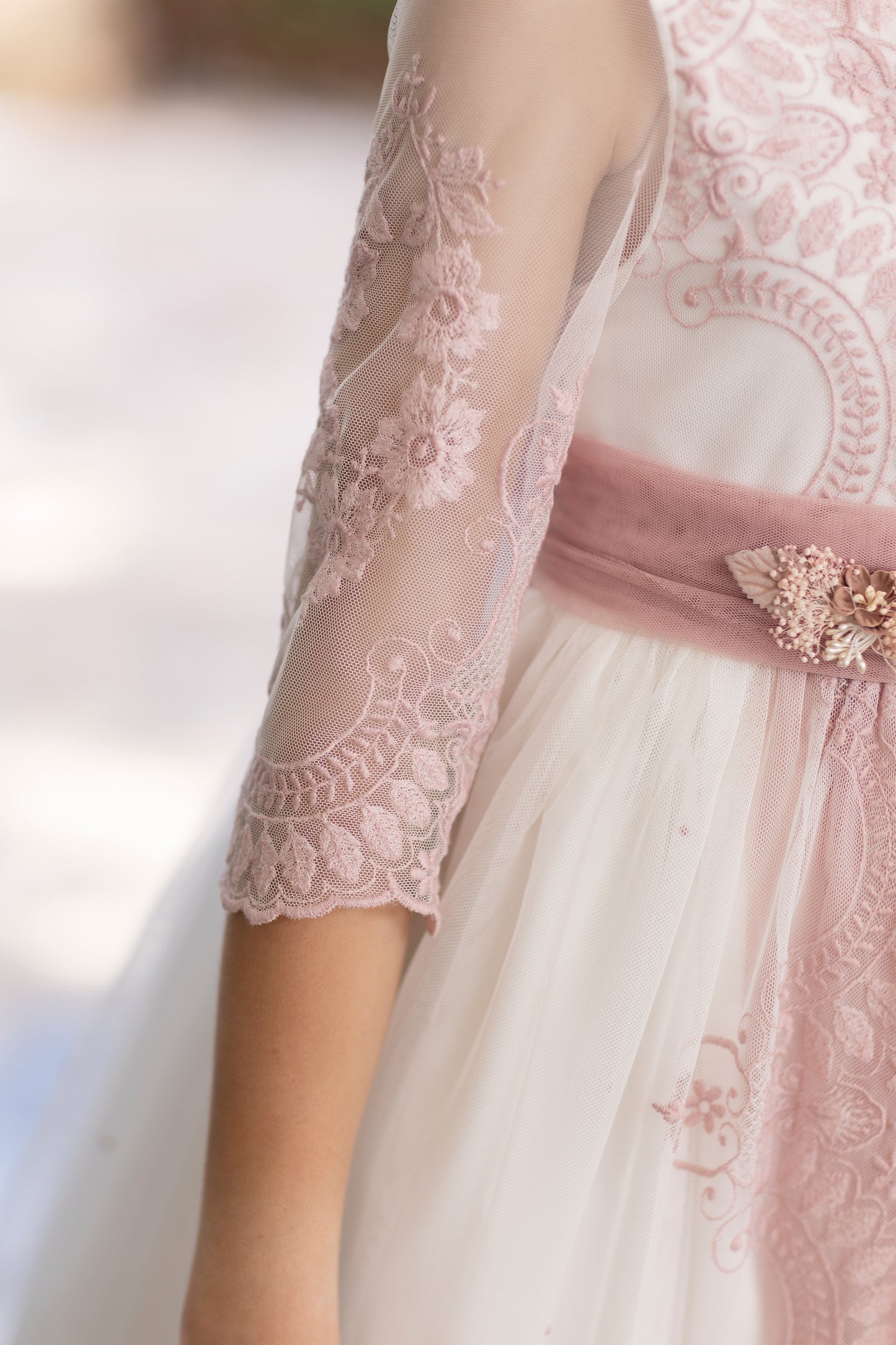 فستان BRIGID LILAC من ماركة ALHUKA. النموذج تم تصنيع Communion AZALEA من التول الليلكي وتطريز الدانتيل المطابق. لون جميل ومختلف وجذاب للغاية. ملابس بتفاصيل مصممة بأحلى الأقمشة. هذا الموديل مصنوع من التول المطرز، إنها ترتدي الزهور على قوس خصرها . فستان بظهر مفتوح مزين بالدانتيل، وزر للإغلاق، مزين بزهور أرجوانية مصنوعة يدوياً على الخصر، له أكمام طويلة شفافة مع دانتيل.