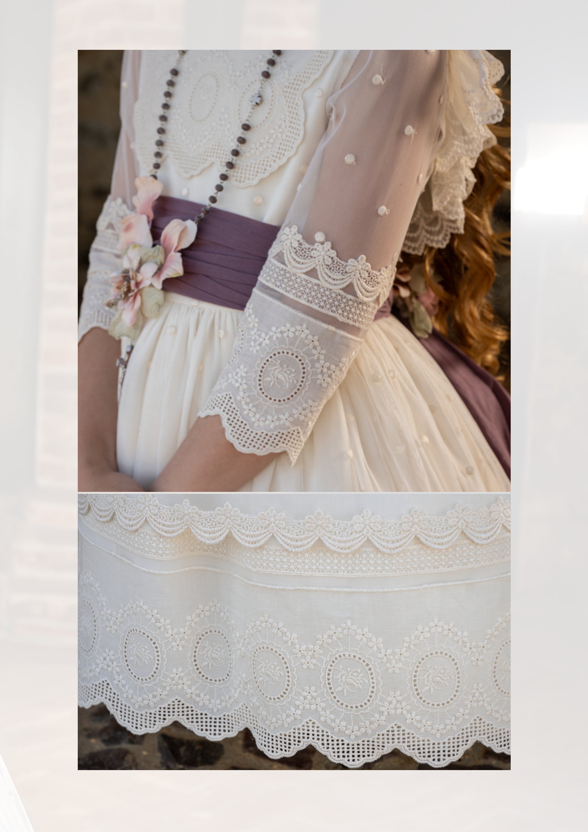 فستان المناولة الأبيض، مطرز بالدانتيل، نصف كم مع كشكشة ضخمة على الطراز البوهيمي، مع تنورة طويلة تصل إلى الأرض. ترتدي حزامًا أرجوانيًا داكنًا مع زهور على ظهره. إنه ثوب ذو تفاصيل حصرية وأنيقة لإضفاء جو من الرومانسية. الفستان له أكمام شفافة مزينة بالدانتيل، رقبة دائرية، ظهر شبه مفتوح، مزين بكشكشة من الدانتيل، تنورة ذات طبقات. إنه ذو نمط عتيق متقن مرسوم عليه من الصدر وعلى التنورة لتتناسب مع الأكمام. إنها ترتدي تاج زهرة من نفس النمط.