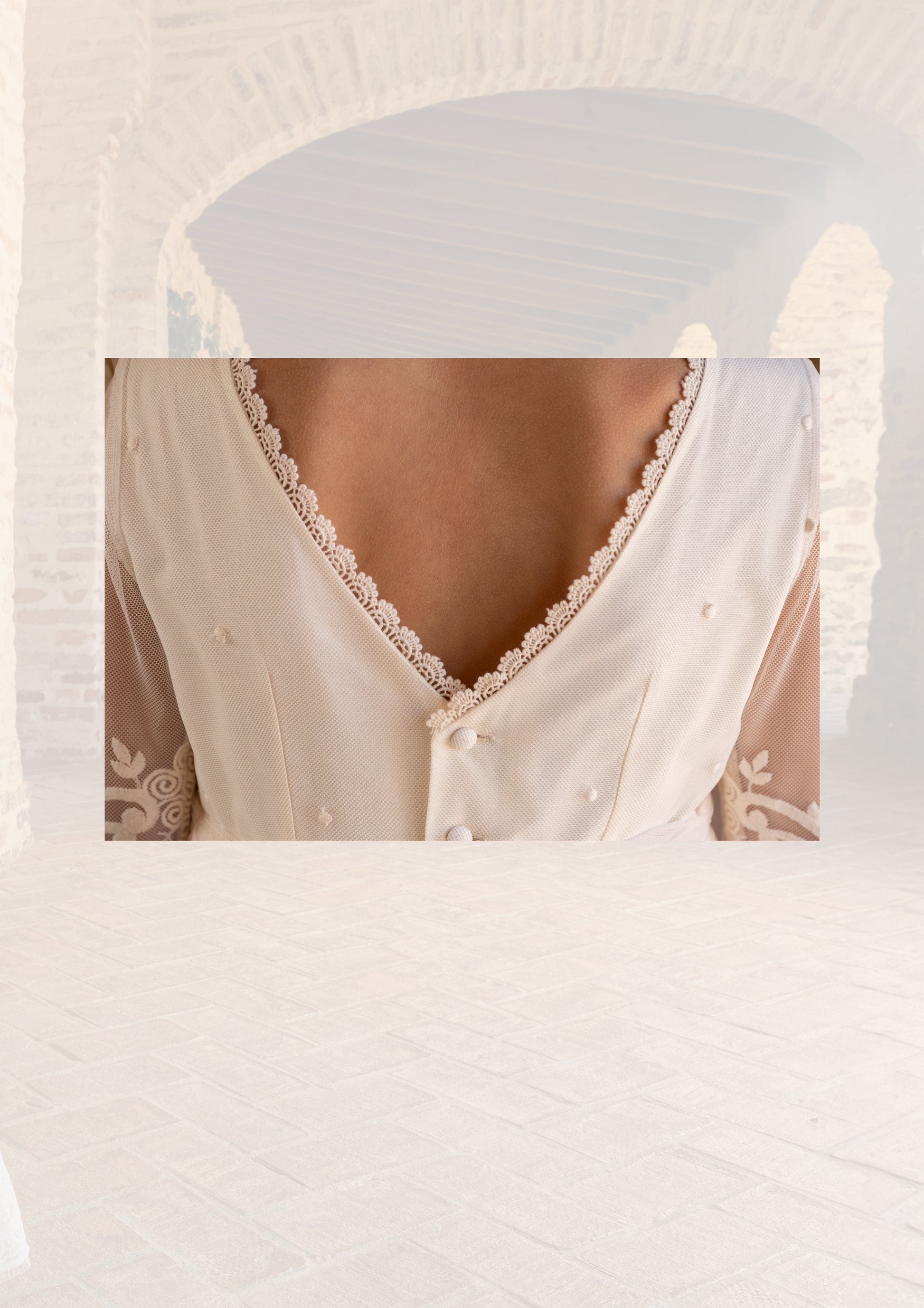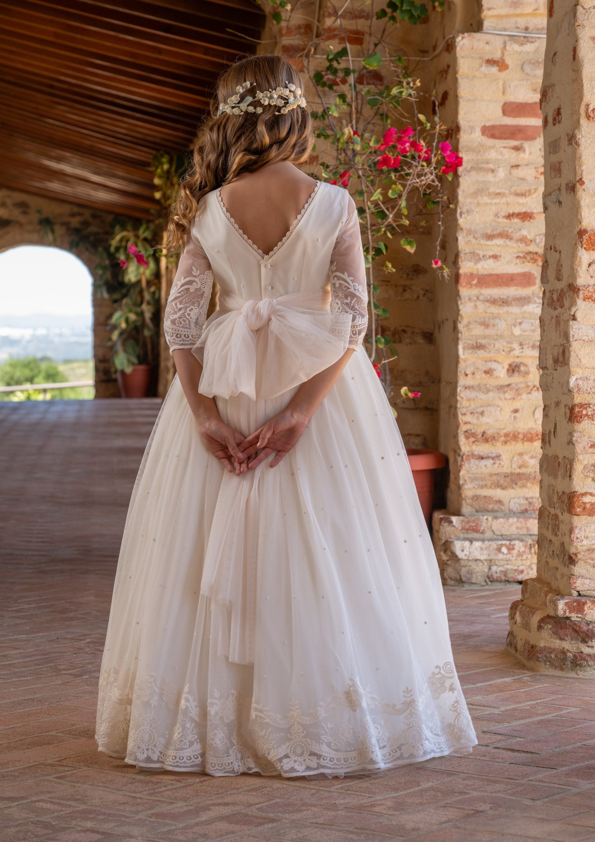فستان أبيض للمناولة، بفيونكة وردية فاتحة، نصف كم، مع تنورة طويلة، مطرزة عند الحاشية بالدانتيل، تصل إلى الأرض. إنه لباس بتفاصيل مثل الرقبة المستديرة وتطريز الدانتيل ولون إكرو الحصري والأنيق لإضفاء الهواء البوهيمي. الفستان من الرقة الخالصة، له أكمام من القماش الخفيف والشفاف مزين بالدانتيل يضفي عليه جواً فاخراً، ظهر مفتوح مع فتحة رقبة على شكل حرف V، مزين بالدانتيل وزر للإغلاق. يحتوي هذا الفستان على تاج زهرة بنفس الأسلوب المذهل.