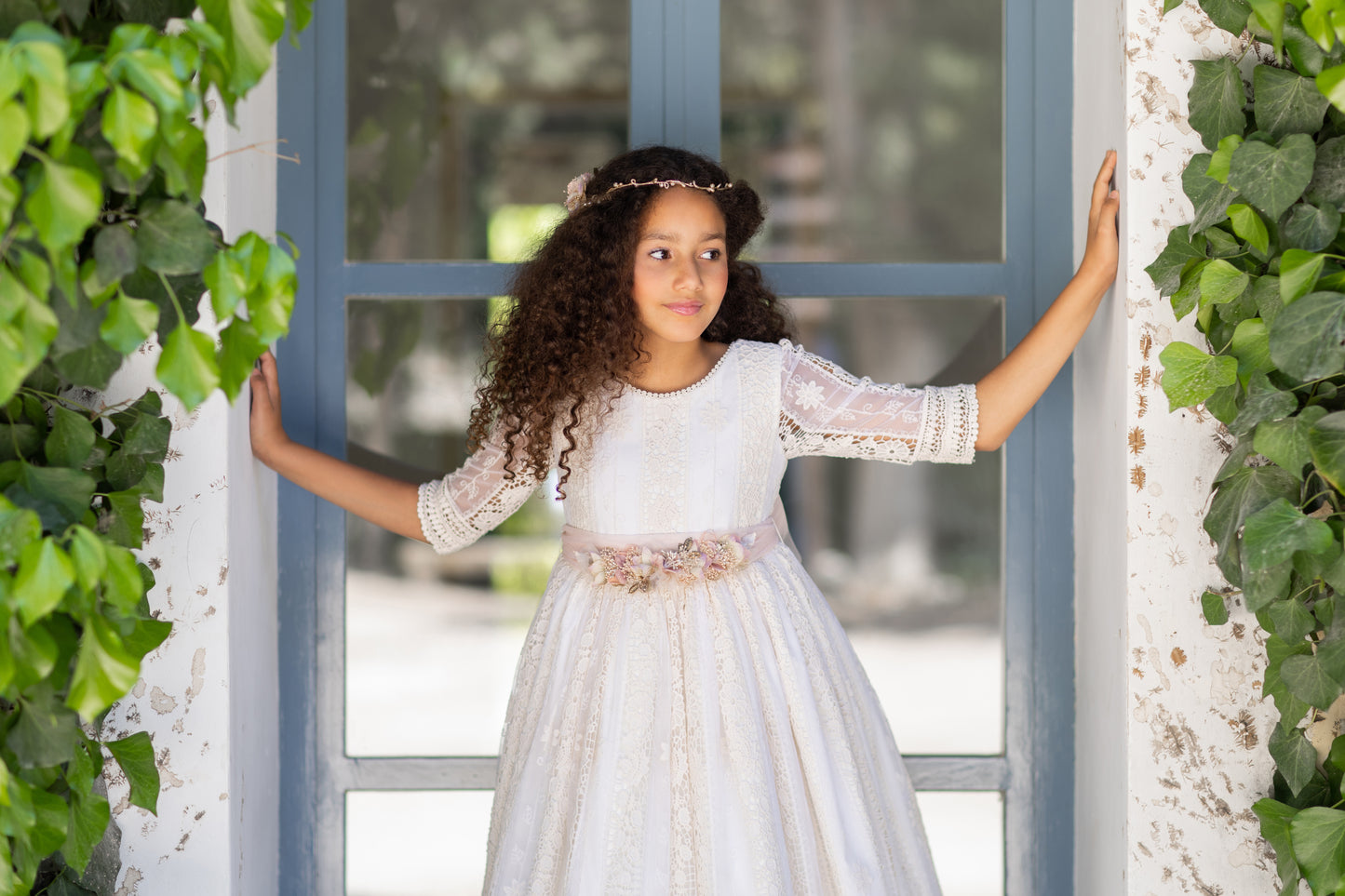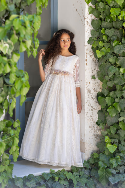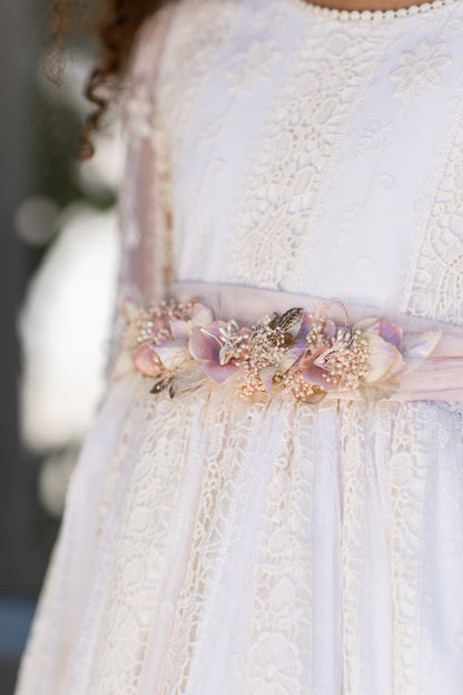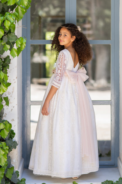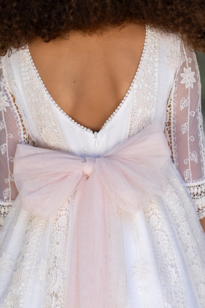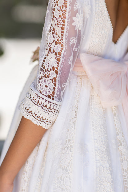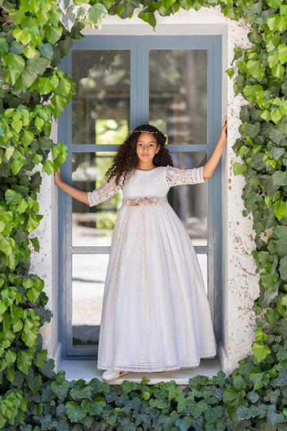 فستان هورتنسيا من ماركة ALHUKA. هذا الموديل مصمم بأحلى الأقمشة. موديل HORTENSIA هذا مصنوع من التول المطرز. فستان بتفصيلة زهور على الحزام، وحزام وردي فاتح. فستان شفاف بأكمام طويلة، تطريز من الدانتيل إكرو، فتحة عنق على شكل حرف V من الخلف مزين بالدانتيل، إغلاق بسحاب مخفي. التاج غير متضمن، السعر منفصل.