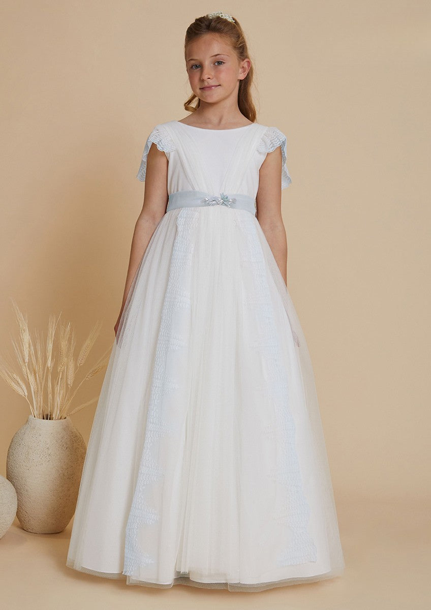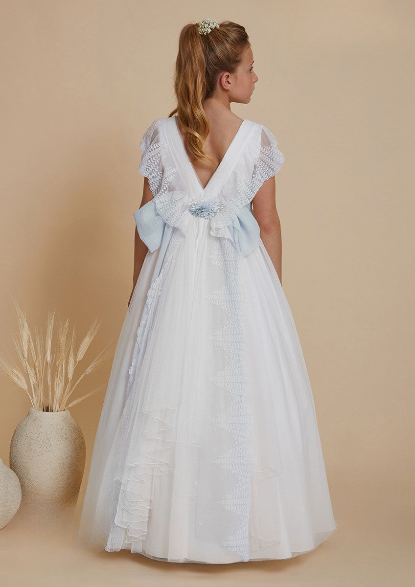اللباس بالتواصل باللون الأبيض مع دانتيل بأسلوب رومانسي للفتيات من ماركة أمايا. فستان بدون أكمام، مزين بدانتيل أخضر مائي، رقبة دائرية، ظهر بفتحة رقبة على شكل حرف V وزر للإغلاق. الحزام الأخضر المائي مع زهور في الأمام وقوس كبير في الخلف. الفستان الطويل د هـ 3 طبقات من نوع الكانكان للحفاظ على شكله وفي الأسفل يوجد تطريز ملون دقيق الماء الأخضر تمثل أمايا دائمًا الأسلوب الرومانسي المميز للعلامة التجارية، وكما هو الحال في كل مجموعة، فهي تمثل التزامًا كبيرًا بالابتكار والحرفية في إكسسواراتها.