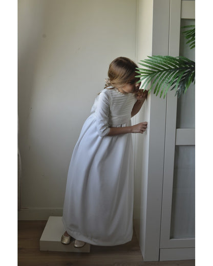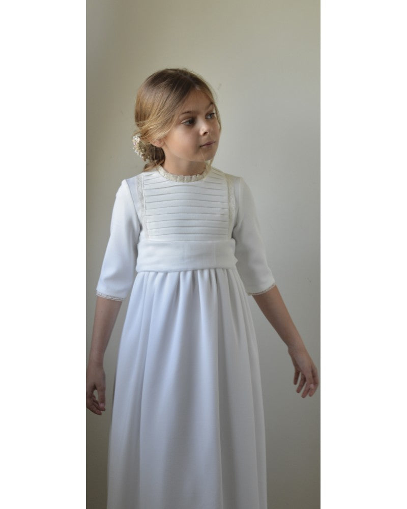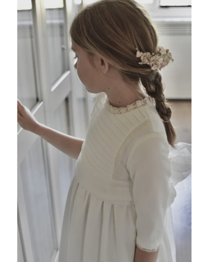 فستان كانديلا كريب للمناولة الأولى للفتيات، يتميز بأكمام طويلة من الكريب، أبيض اللون، وأكمام طويلة، ورقبة دائرية، مزين بالدانتيل، والصدر مزين بقماش مطوي، والظهر مغلق بسحاب مخفي، وبه فيونكة من الكتان (ينصح بها)، مريحة وحساسة. يمكنك تغيير القوس إلى أي لون مع تاج الزهرة الخاص بك. فساتين أنيقة من ماركة Petritas، يتم تصنيعها فقط بجودة عالية في إسبانيا، وفقًا للمفهوم الإبداعي الحصري للعلامة التجارية.
