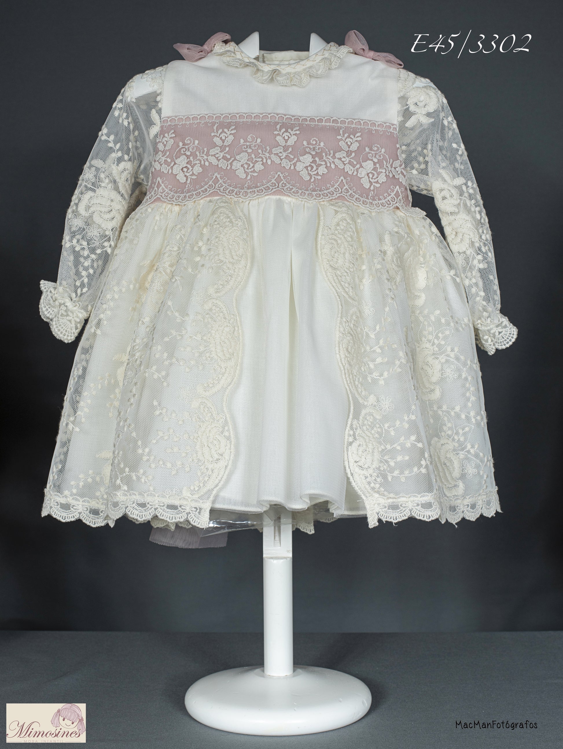 فستان من الدانتيل باللون البيج والوردي 3022 مع سروال داخلي وقبعة لحفل التعميد من MIMOSINES