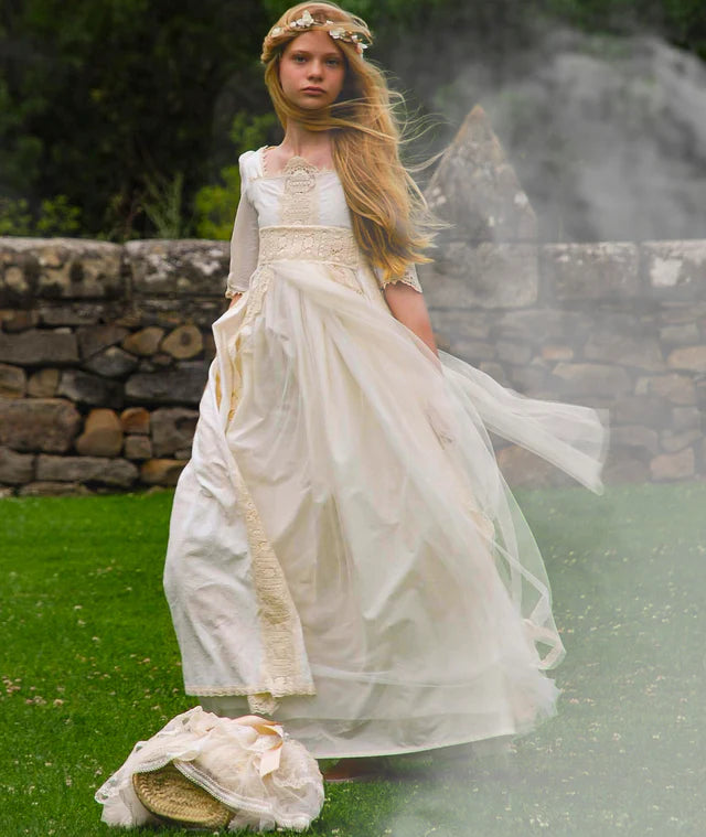فستان مناولة إكرو مع قوس وزهور إكرو، وأكمام طويلة، مع تنورة طويلة مزينة بالدانتيل تصل إلى الأرض. وهو عبارة عن قطعة ملابس ذات تفاصيل مثل الياقة الدانتيل وخط العنق المفتوح المزين بتطريز حصري وأنيق يتماشى مع القوس لإضفاء جو بوهيمي. الفستان رقة خالصة له أكمام مصنوعة من قماش خفيف وشفاف مزين بالدانتيل الذي يتناسب مع التنورة. يتميز بنمط عتيق متقن مرسوم على المشد والقوس الخلفي لإضفاء طابع أنيق على الشكل. إنها ترتدي تاج زهرة من نفس النمط.