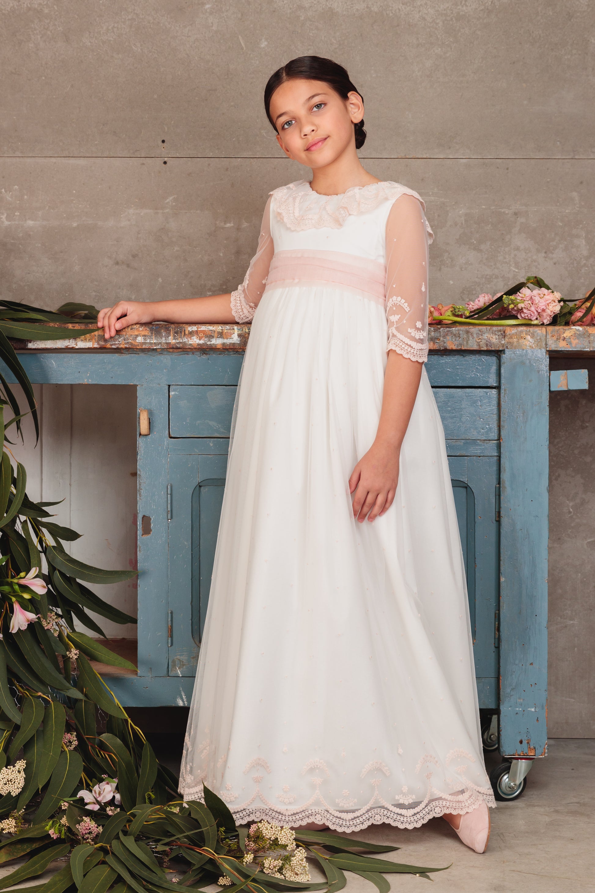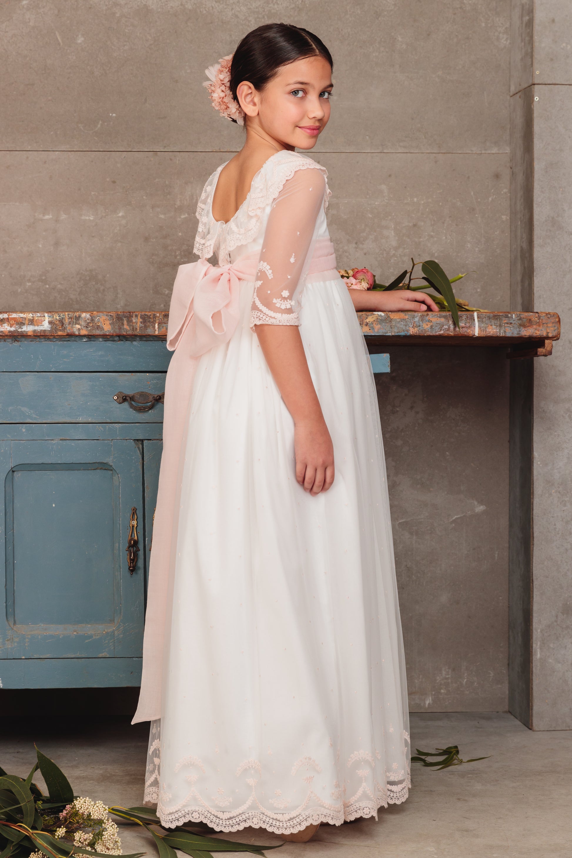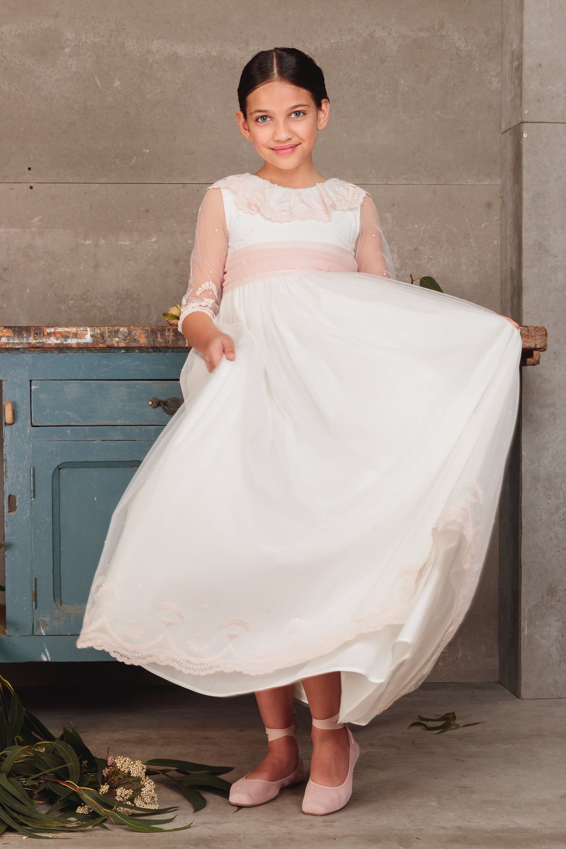 فستان المناولة الأولى باللون الأبيض للفتيات، مصنوع من قماش التول الأبيض مزين بتطريز الزهرة الوردية، وأكمام طويلة مزينة بتطريز الزهرة وفيونكة من التول الوردي الفاتح، مريح ورقيق. يتميز الفستان بتنورة طويلة تصل إلى الأرض، منتهية بالدانتيل المتناسق مع الأكمام، ذو رقبة دائرية وفتحة رقبة مفتوحة، مزين بالكشكشة. تمثل Flor de C التفاصيل في فساتينها التي تحول فستان المناولة والأراس إلى شيء مميز للغاية، مع إمكانية تخصيص جلد الفستان من حيث اللون والقماش. تأتي فساتين المناولة بأي حجم ويمكن تصنيعها حسب المقاس.
