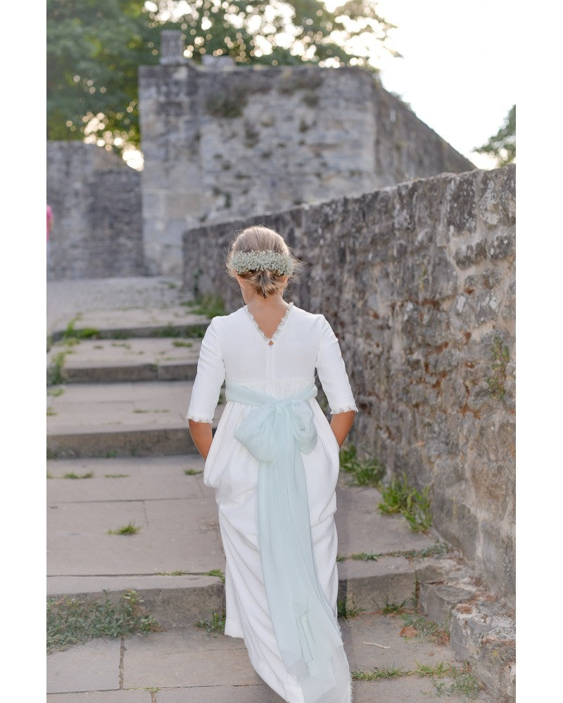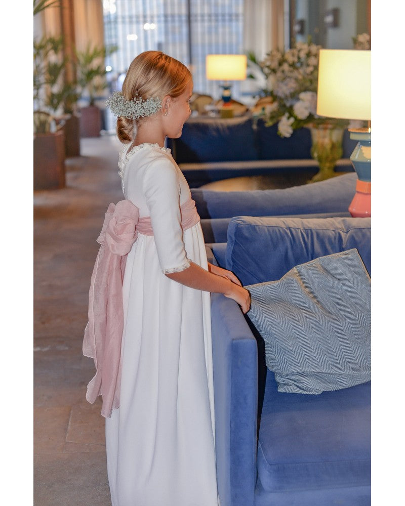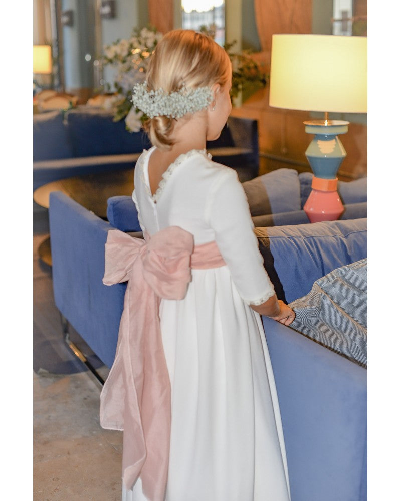 فستان المناولة للفتيات ذو أكمام طويلة وطبقات مزدوجة باللون الأبيض مع ظهر مفتوح مع دانتيل وفيونكة من التول الوردي (مستحسن)، مريح ورقيق. يمكنك تغيير القوس إلى أي لون مع تاج الزهرة الخاص بك. فساتين أنيقة من ماركة Petritas، يتم تصنيعها فقط بجودة عالية في إسبانيا، وفقًا للمفهوم الإبداعي الحصري للعلامة التجارية.