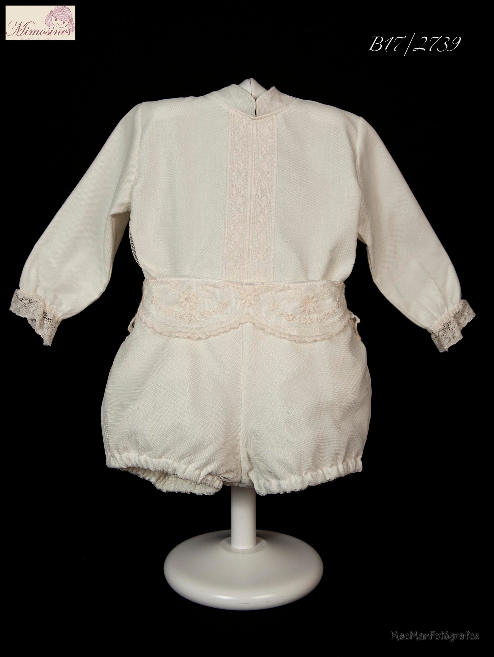 مجموعة للأطفال للتعميد باللون الخام ومريحة وخفيفة. طقم بأكمام طويلة مع قبعة من الدانتيل وحذاء مزين بالدانتيل.