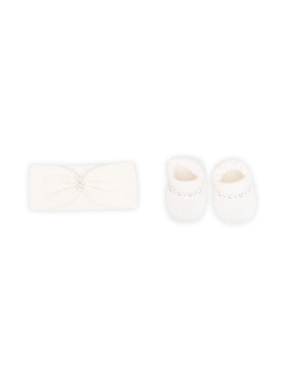 أحذية وعصابة رأس للفتيات الصغيرات من العلامة التجارية اللؤلؤة . اللون أبيض ومزين باللؤلؤ. ستكون ملابس الفتيات الصغيرات هي الملابس الأكثر راحة لطفلك الصغير. وهي مصنوعة من القطن الناعم مع الأصفاد. الحزام مصنوع من قطن جيرسي ناعم ومطاط. La Perla هي علامة تجارية إيطالية تستخدم مواد طبيعية حصرية مثل الحرير والكشمير والكتان.