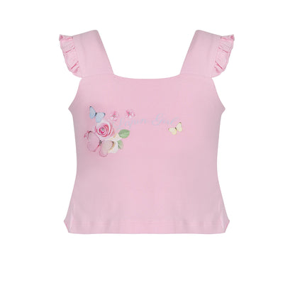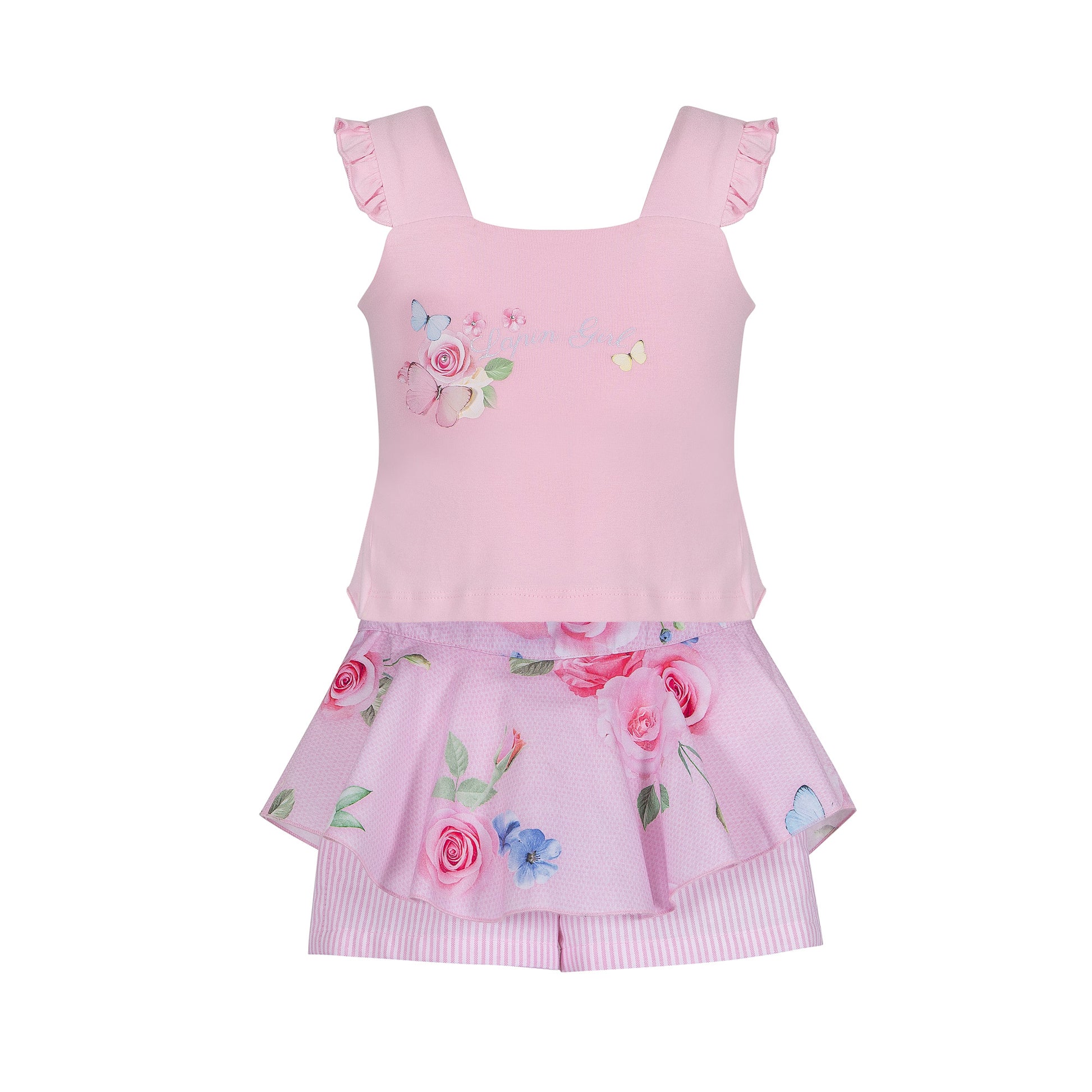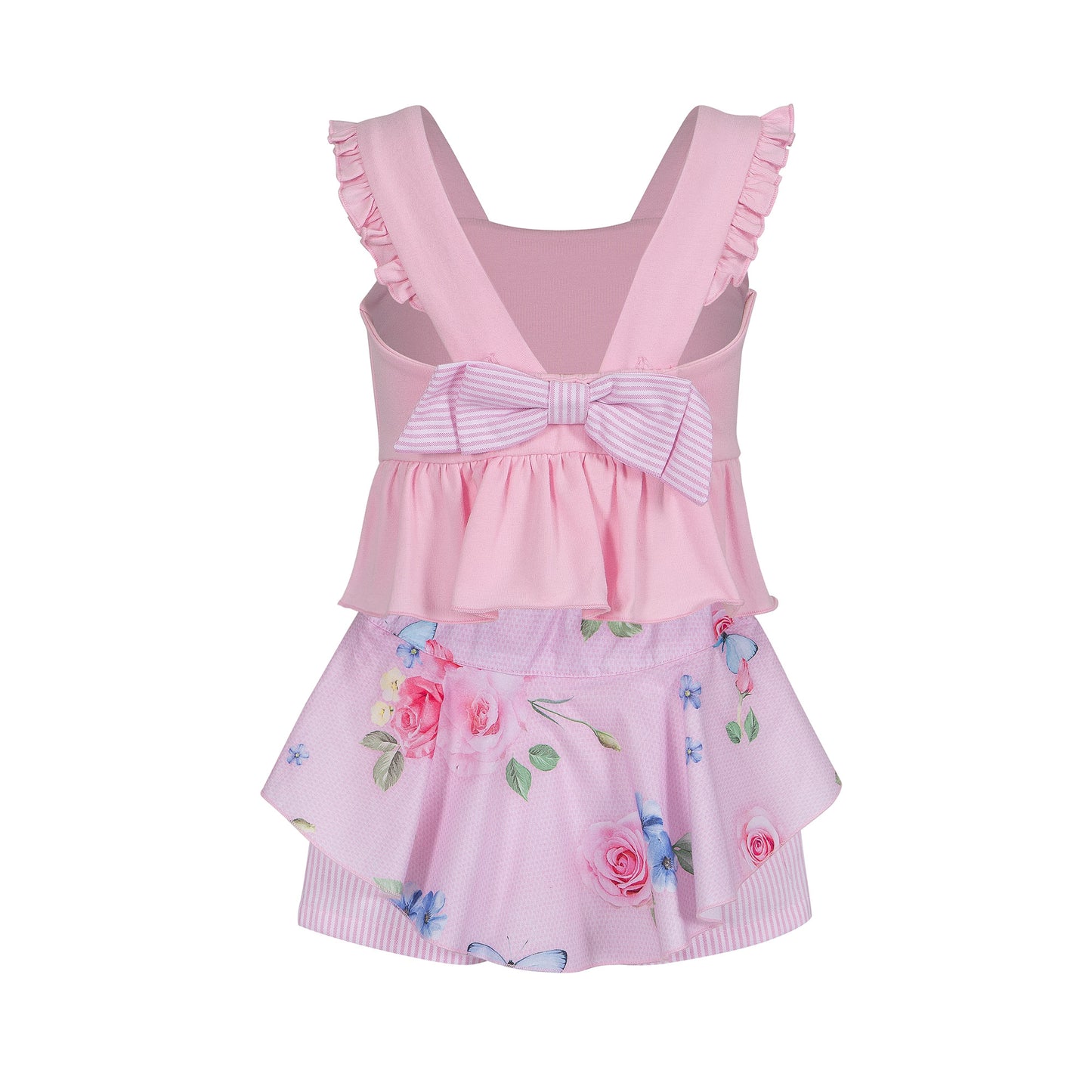 مجموعة كاملة من ماركة لابين هاوس. ملابس بتفاصيل، مع كشكشة ورسمة وردة وفراشات في الأمام، مع القوس في الخلف. طقم كامل مكون من تيشيرت وردي بدون أكمام وشورت مزين بتنورة قماش مطبوعة بالورود، مريح وراقي. مثالية للمناسبات الخاصة في فصلي الربيع والصيف. نسيج عالي الجودة بتصميم أنيق وغير رسمي. طقم من ماركة لابين هاوس، مزيج من التواضع الراقي والأناقة والجودة. التطوير الدقيق للأنماط والاهتمام الكبير بكل التفاصيل يجعل ملابس هذه العلامة التجارية عملية ومريحة.