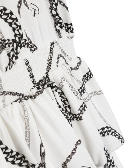 فستان مع فكرة سلاسل العلامة التجارية LIUJO . لون أبيض، طبعة سلسلة، رقبة دائرية، أكمام على شكل كاب، حزام خصر مطاطي، تفاصيل مكشكشة، حاشية واسعة وتصميم يصل إلى الفخذ.