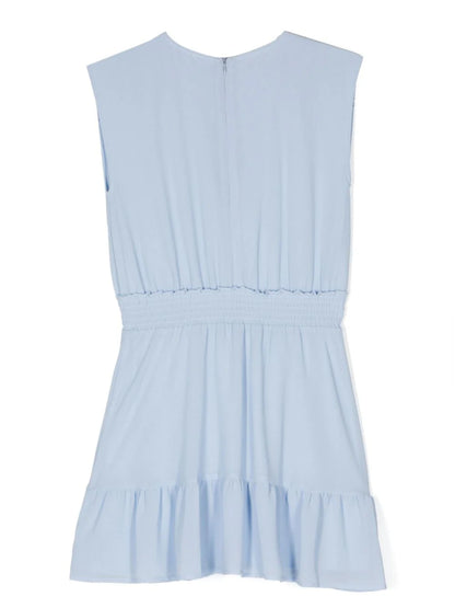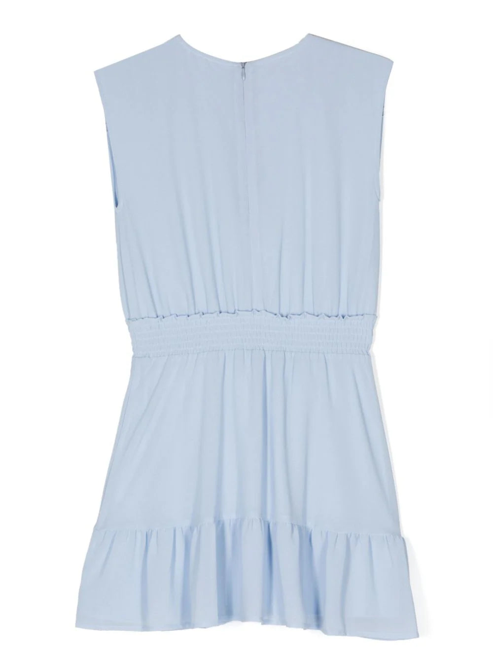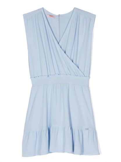 فستان ماركة LIUJO. لون أزرق فاتح، تصميم بلا أكمام، رقبة على شكل حرف V، حزام خصر مطاطي، وحاشية مكشكشة. فستان العلامة التجارية مزيج LIUJO من التواضع والأناقة المتطورة والجودة. التطوير الدقيق للأنماط والاهتمام الكبير بكل التفاصيل يجعل ملابس هذه العلامة التجارية عملية ومريحة.