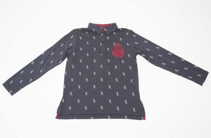 قميص بولو باللون الأزرق الداكن مصنوع من القطن المطبوع وأكمام طويلة. يحمل شعار العلامة التجارية باللون الأحمر المطرز على الجهة الأمامية.