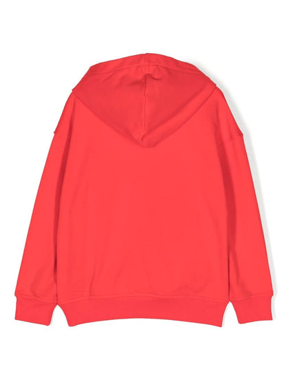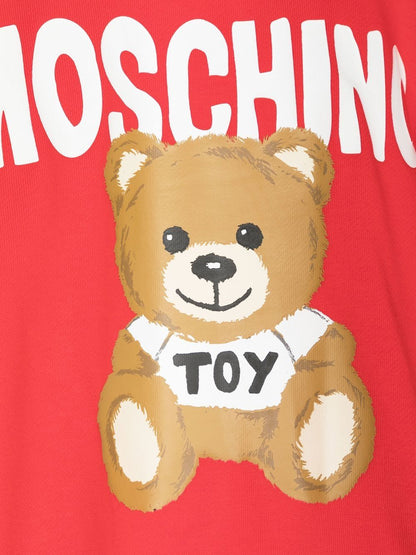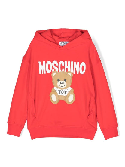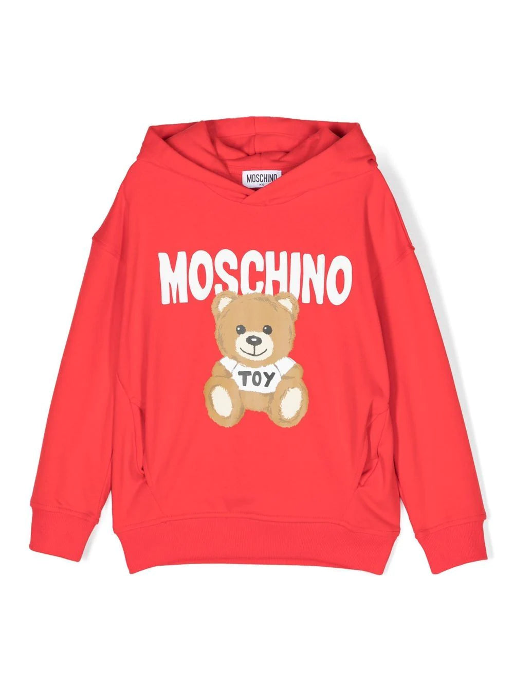 سترة من ماركة موسكينو. أحمر ، قطن، شعار مطبوع على الصدر، طبعة دمية دب، تصميم بغطاء للرأس، جيبان أماميان، أكمام طويلة، وحاشية مضلعة.