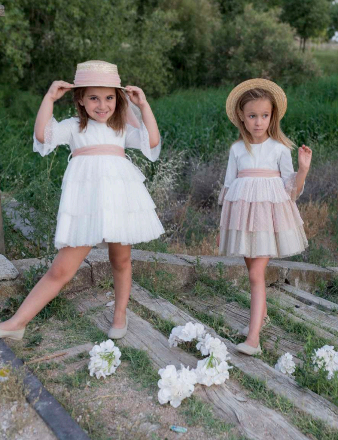 فستان الحفل باللون الأبيض، بأكمام طويلة، مع تنورة قصيرة من ثلاث طبقات مع كشكشة. إنه لباس بتفاصيل مثل الرقبة المستديرة وخط العنق من نفس النمط الحصري. الفستان مصنوع من قماش بلوميتي وله أكمام منتهية بكشكشة أنيقة للغاية وقوس من التول لإضفاء لمسة جمالية على الشكل. فستان من ماركة Marina's Moda ، مُعبأ دائمًا بمعايير السلامة الأكثر تطلبًا ودائمًا تحت ختم "صنع في إسبانيا". يسعى مصممو الأزياء إلى مراعاة احتياجات الفتيات إلى الحد الأقصى، مما يخلق قطعة مريحة وعملية للفتيات تتميز بالجمال والأناقة.