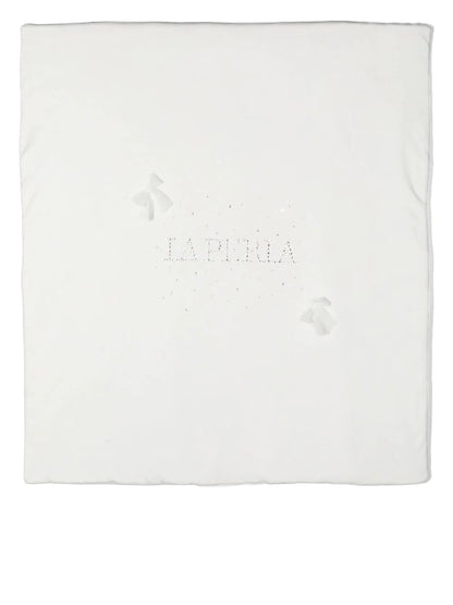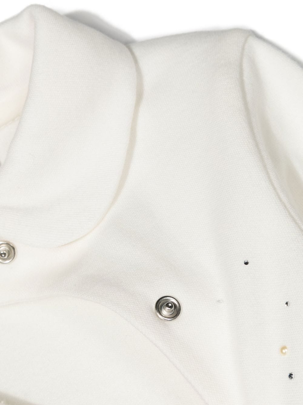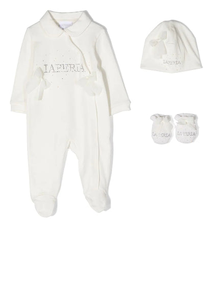 بودي سوت بأكمام طويلة مزين بفيونكة وكريستالات صناعية وشعار الماركة، بأرجل طويلة، مع قبعة وحذاء للفتيات الصغيرات، سيكون الملابس الأكثر راحة لصغيرتك لربيع وصيف. مصنوع من القطن، باللون الأبيض، مصنوع من قماش محبوك لطيف وناعم. رائع بتصميمه، فهو مصنوع من كريستالات صناعية في الأمام. تتناسب هذه المجموعة مع غطاء الرأس والأحذية البيضاء المزينة أيضًا بالقوس.