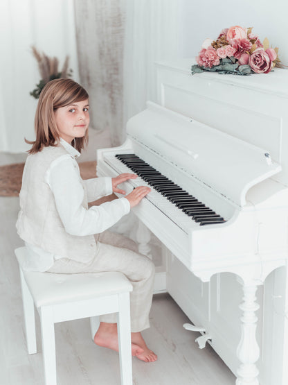 بدلة كتان كاملة من ماركة Mimilú. طقم كامل يتكون من سترة بيج وقميص أبيض أنيق وبنطلون بيج. بدلة مريحة وحساسة. مثالية للمناسبات الخاصة لربيع وصيف. قماش عالي الجودة بتصميم رسمي أنيق. باللون البيج فقط للأطفال حتى سن 14 عامًا. يسعى مصممو الأزياء إلى مراعاة احتياجات الأطفال إلى أقصى حد، مما يخلق قطعة مريحة وعملية للأطفال تتميز بالجمال والأناقة.