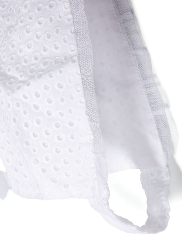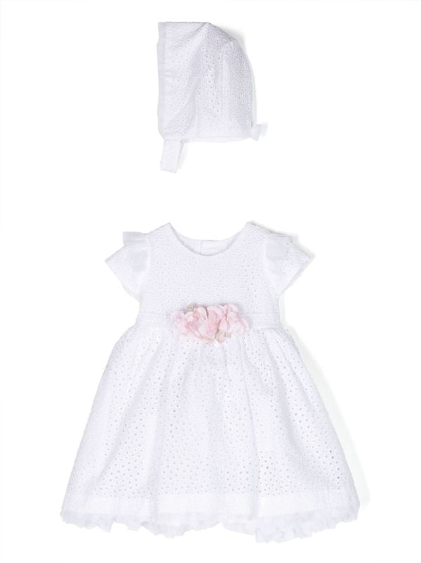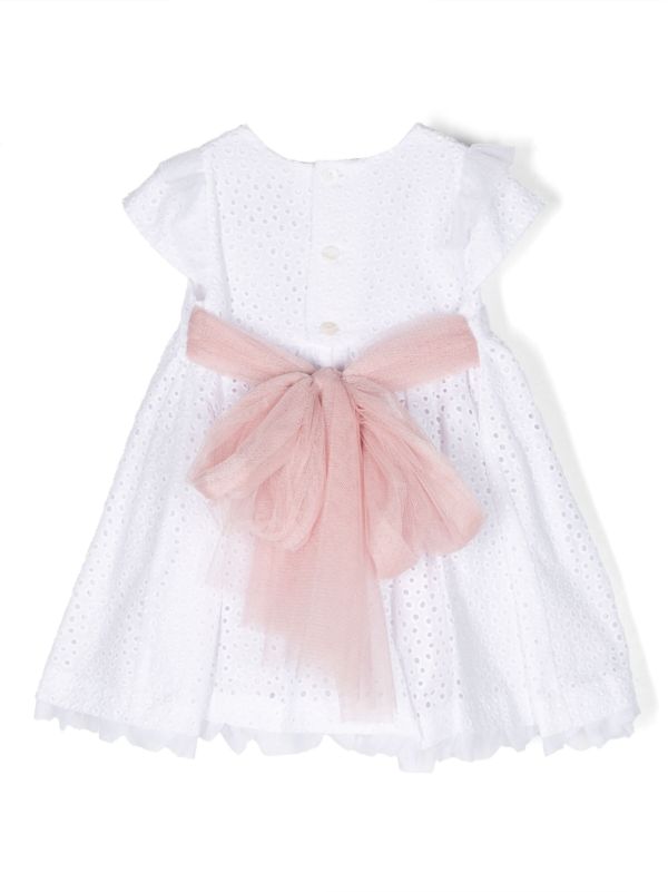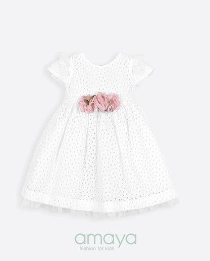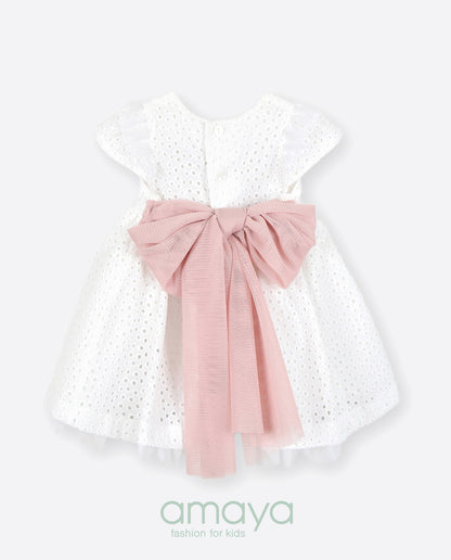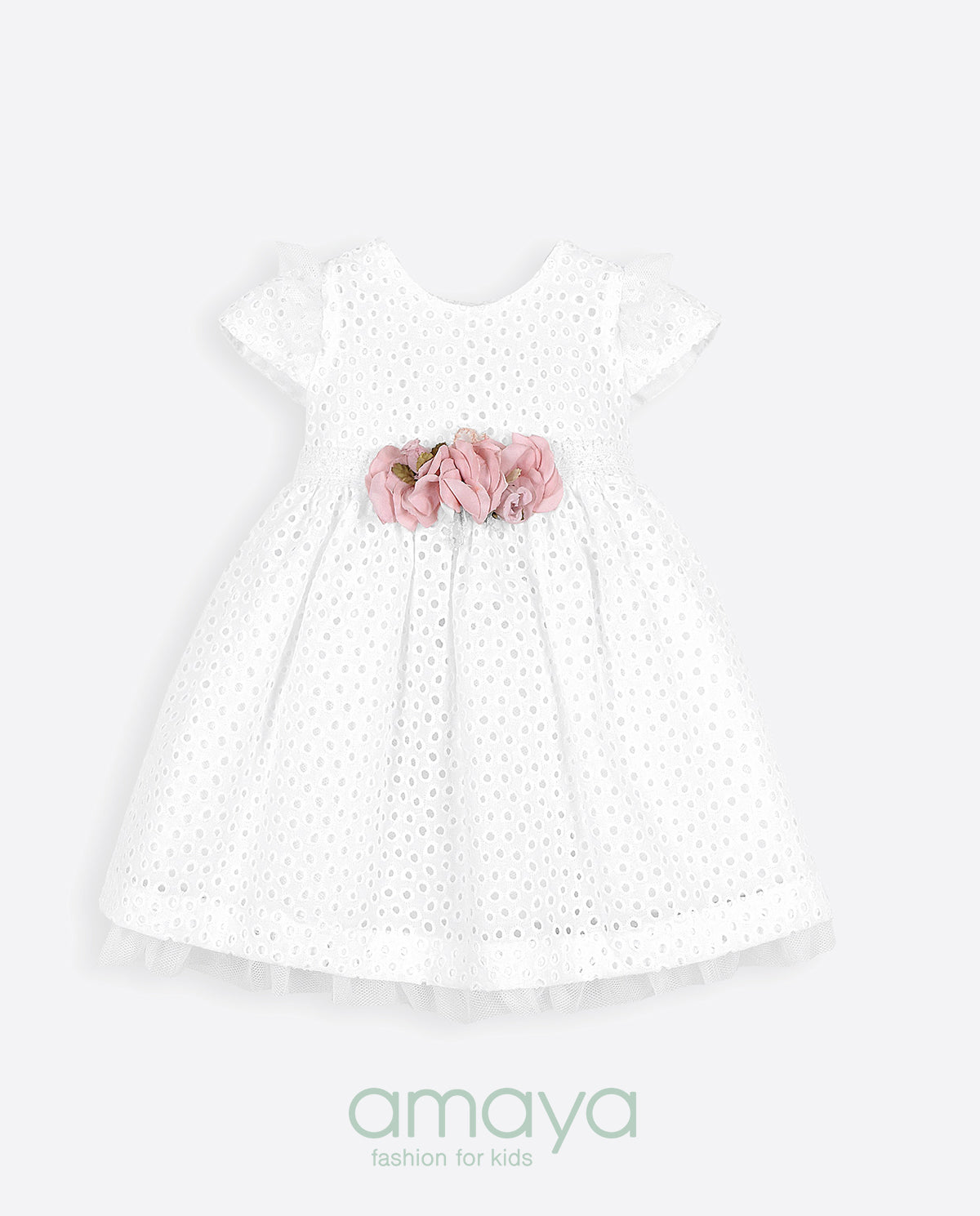 فستان الحفل من ماركة أمايا. ملابس ذات تفاصيل مصممة بأحلى الأقمشة. وهي مصنوعة من القطن، ترتدي الزهور على قوس الخصر الوردي. الفستان بدون أكمام مزين بكشكشة من التول الأبيض والقماش المنقط، وياقة مغلقة. ل تمثل MAYA دائمًا النمط الرومانسي المميز للعلامة التجارية، وكما هو الحال في كل مجموعة، فهي تمثل التزامًا كبيرًا بالابتكار والحرفية في إكسسواراتها.