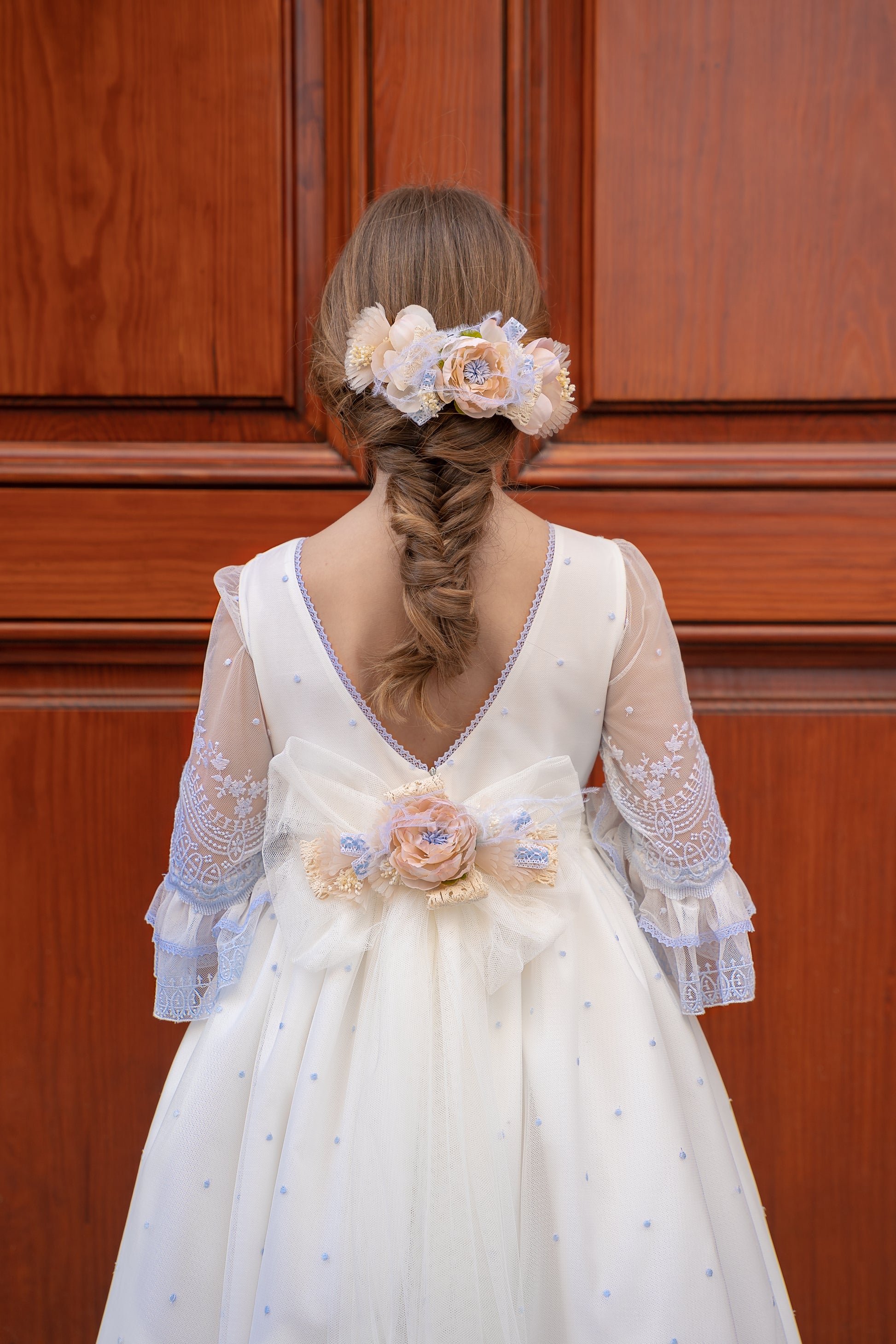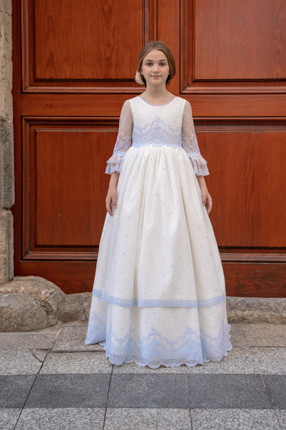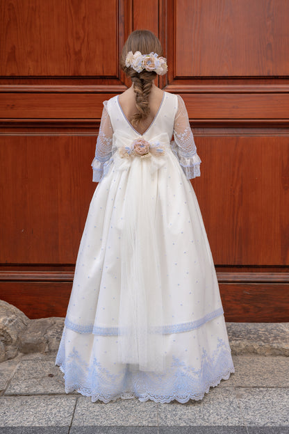 فستان غريتا للمناولة من ماركة ALHUKA. وهو موديل مصمم بأحلى الأقمشة. موديل غريتا هذا مصنوع من التول المطرز بأسلوب رومانسي، مع لمسة مختلفة على التنورة على شكل الشلال، كاشفة عن التول باللون الأزرق الفاتح. وأكمام فرنسية جميلة بكشكشة مزدوجة وتفاصيل رائعة. انه حلو!