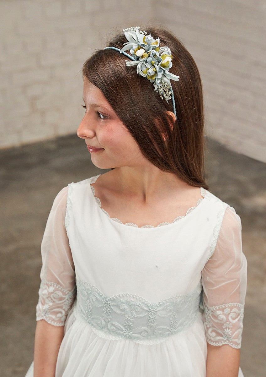 El فستان de comunión en color blanco y verde agua para niña de la marca AMAYA. El Vestido con manga larga bordada y escote redondo delante y escote V bordado detras. El cinturón bordado de color verde agua y un lazo en la espalda. El Vestido de la falda larga de 3 capas tipo cancán para mantener su forma. AMAYA representa siempre el estilo romántico característico de la firma, y como en cada colección, una gran apuesta por la innovación y la artesanía de sus complementos. Corona y flor del cinturon no están incluidos