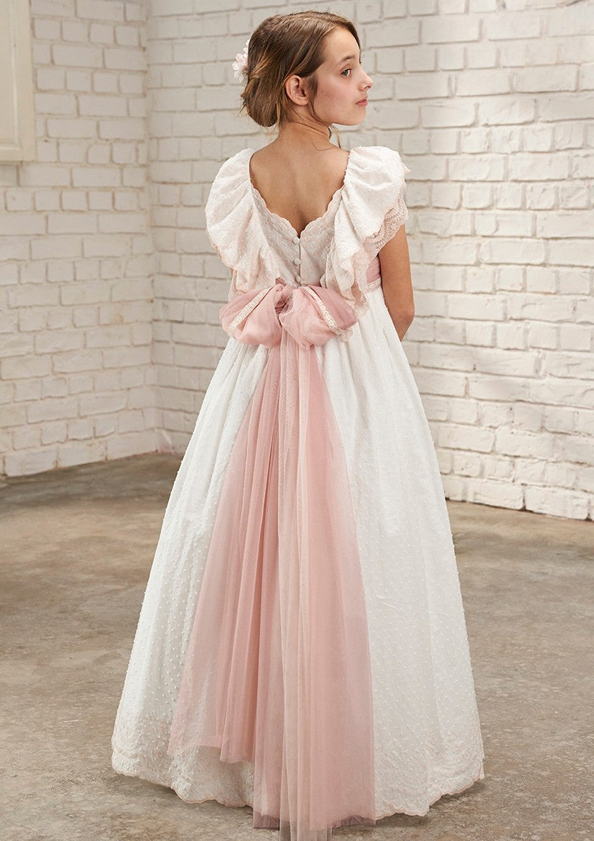 El Vestido de comunión en color blanco en un estilo romántico para niña de la marca AMAYA. Vestido de niña largo de comunión en algodón plumeti con detalles bordados en rosa. Destacada los entredoses del delantero y las mangas en volantes que caen en cascada por la espalda. AMAYA representa siempre el estilo romántico característico de la firma, y como en cada colección, una gran apuesta por la innovación y la artesanía de sus complementos.