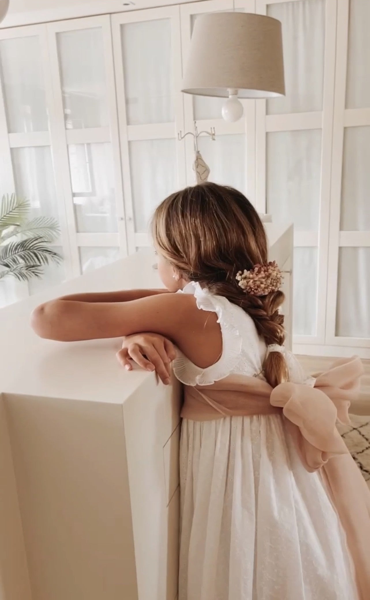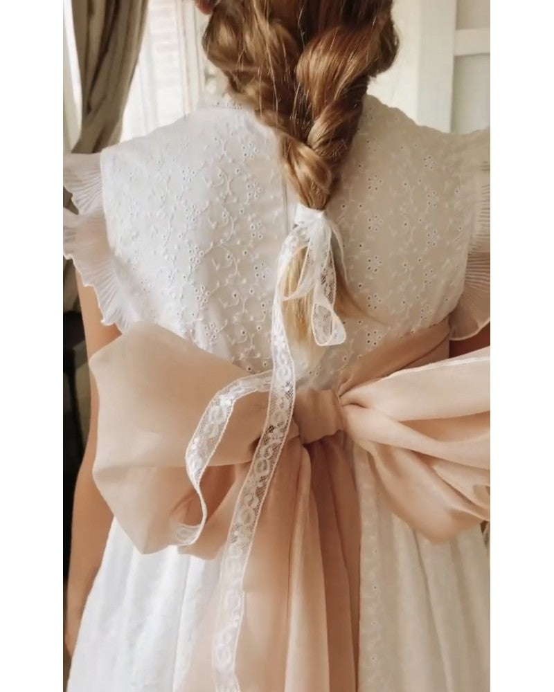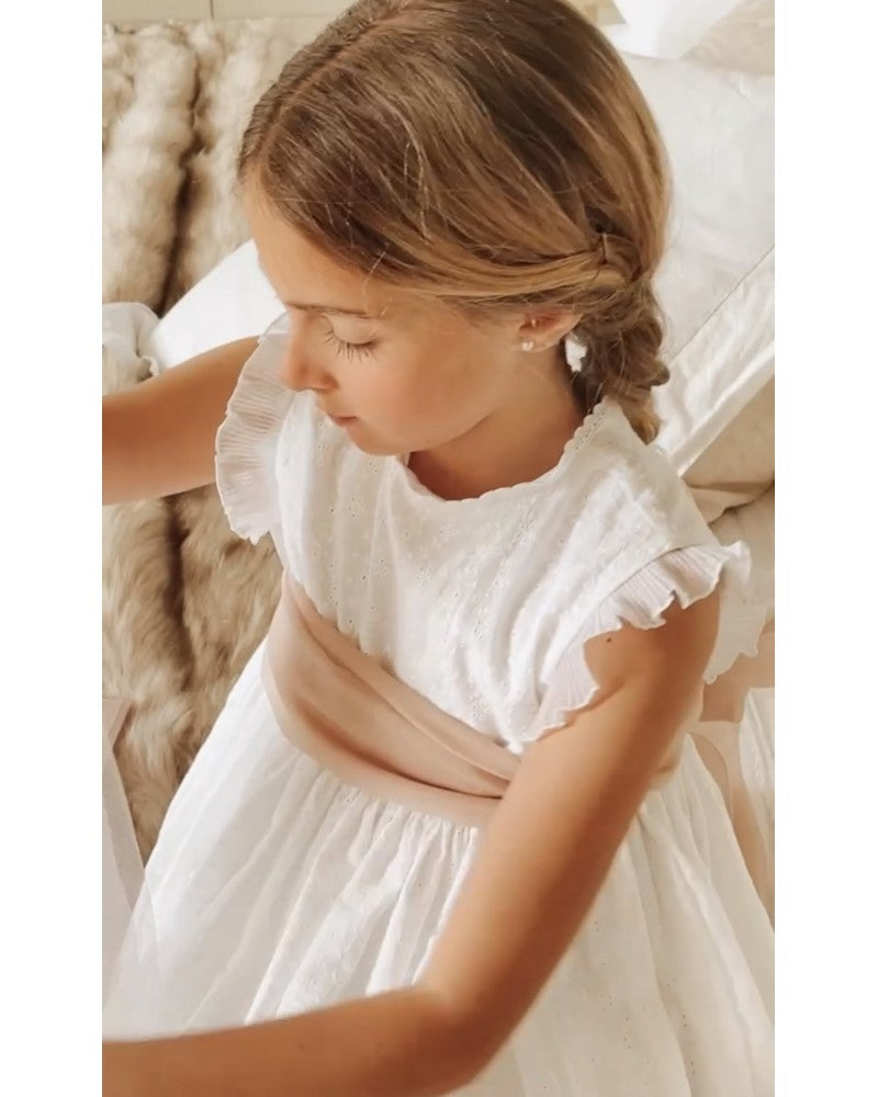 فستان المناولة للفتيات بأكمام قصيرة وطبقات مزدوجة باللون الأبيض مع ظهر مغلق وفيونكة من التول، مريح ورقيق. مثالية للمناسبات الخاصة . فساتين أنيقة من ماركة Petritas، يتم تصنيعها فقط بجودة عالية في إسبانيا، وفقًا للمفهوم الإبداعي الحصري للعلامة التجارية.