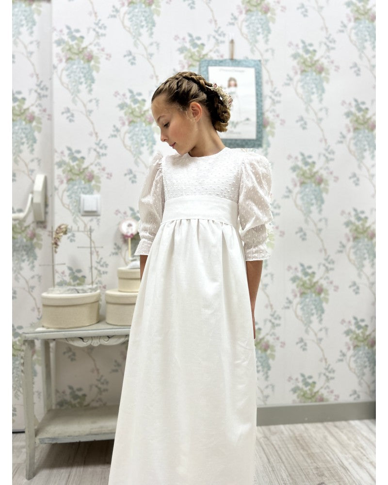 فستان المناولة الأولى للفتيات ذو أكمام طويلة من الكتان وطبقة مزدوجة باللون الأبيض مع إغلاق من الخلف بسحاب، وله فيونكة من الكتان (ينصح بها)، مريح ورقيق. يمكنك تغيير القوس إلى أي لون مع تاج الزهرة الخاص بك. فساتين أنيقة من ماركة Petritas، يتم تصنيعها فقط بجودة عالية في إسبانيا، وفقًا للمفهوم الإبداعي الحصري للعلامة التجارية.