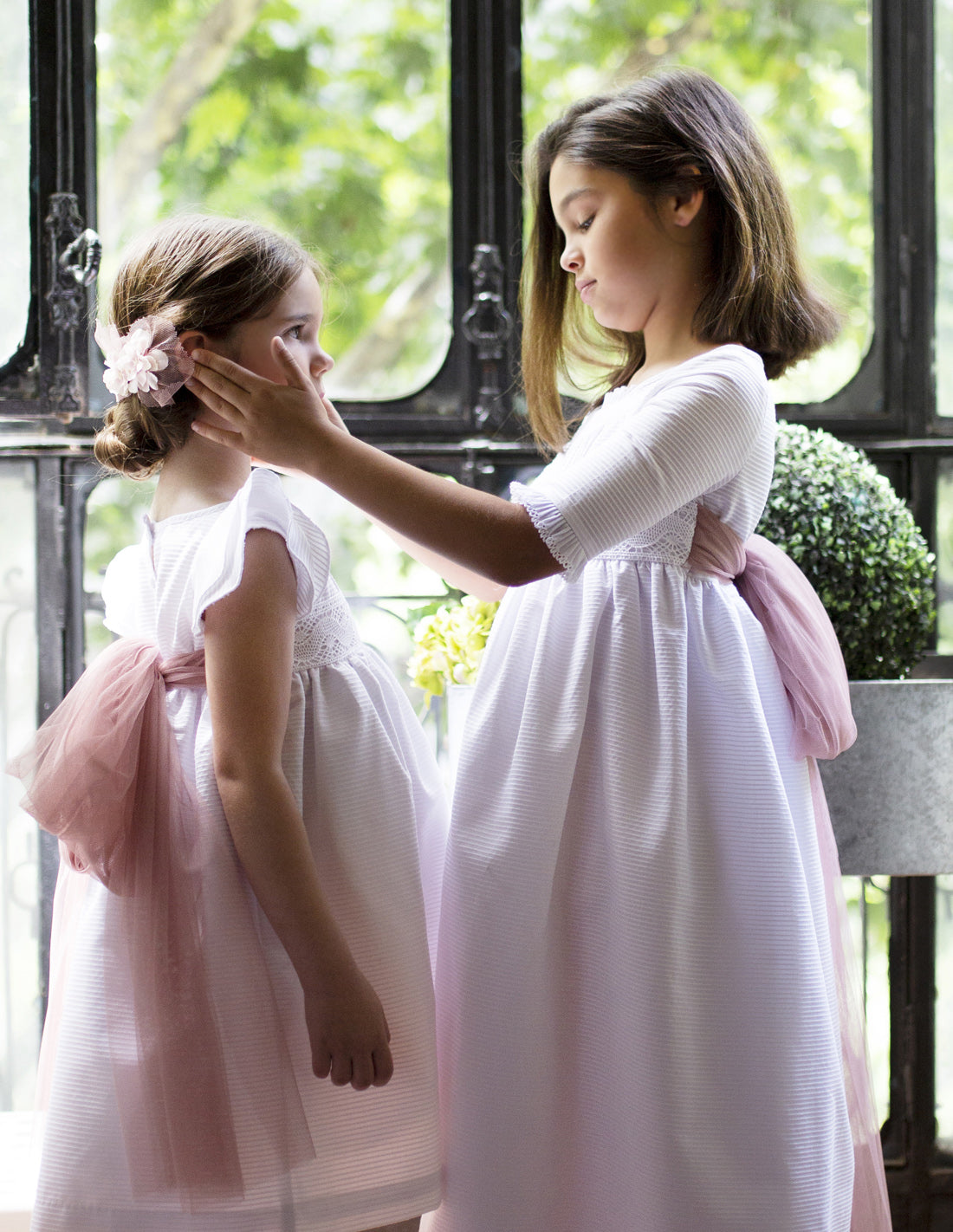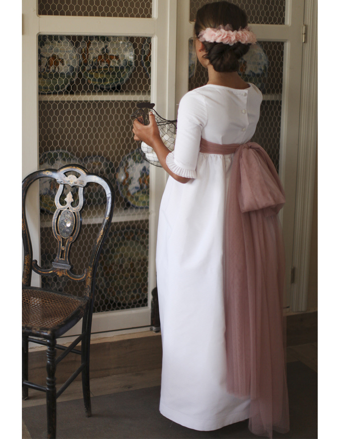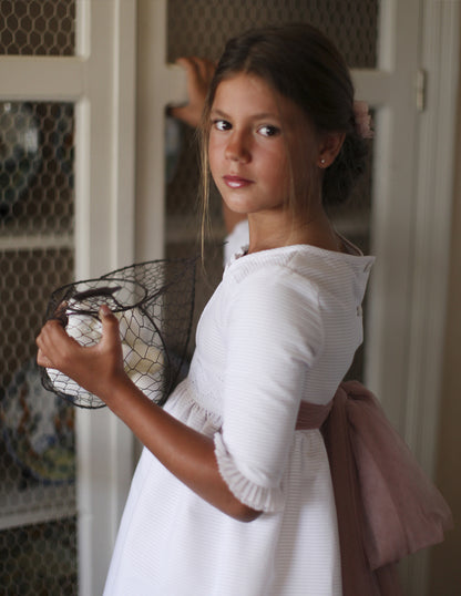 فستان المناولة الأبيض للبنات، نصف كم منته بالكشكشة. فستان بتنورة طويلة ، صدر مطرز بزخارف قبلية، أكمام متطابقة مع زخارف الطبقة الخارجية للتنورة . يحتوي الفستان على قوس وردي سميك وعميق في الخلف لإضفاء طابع أنيق على الشكل.