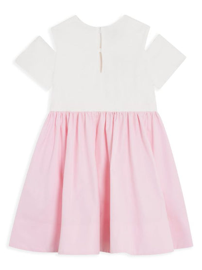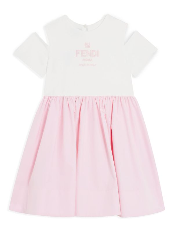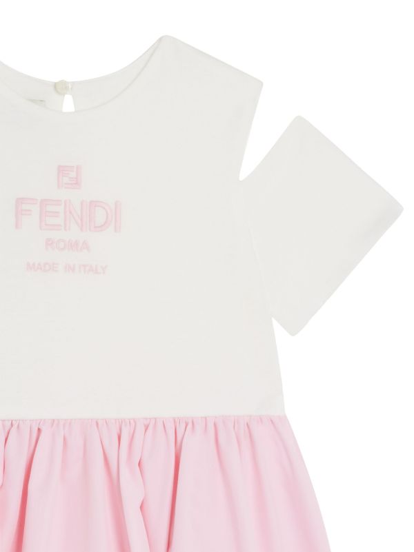 فستان بشعار FF من ماركة Fendi Kids. أسود، رمادي، قطن، تفاصيل مقصوصة، شعار FF مطرز، تفاصيل لامعة، حزام خصر يحمل الشعار، رقبة دائرية، أكمام قصيرة ونمط واسع. تتمتع Fendi Kids بعلامة تجارية مميزة وشعبية في جميع أنحاء العالم. مجموعات الأطفال تكرر النماذج للبالغين، وتجمع بين الفخامة والراحة.