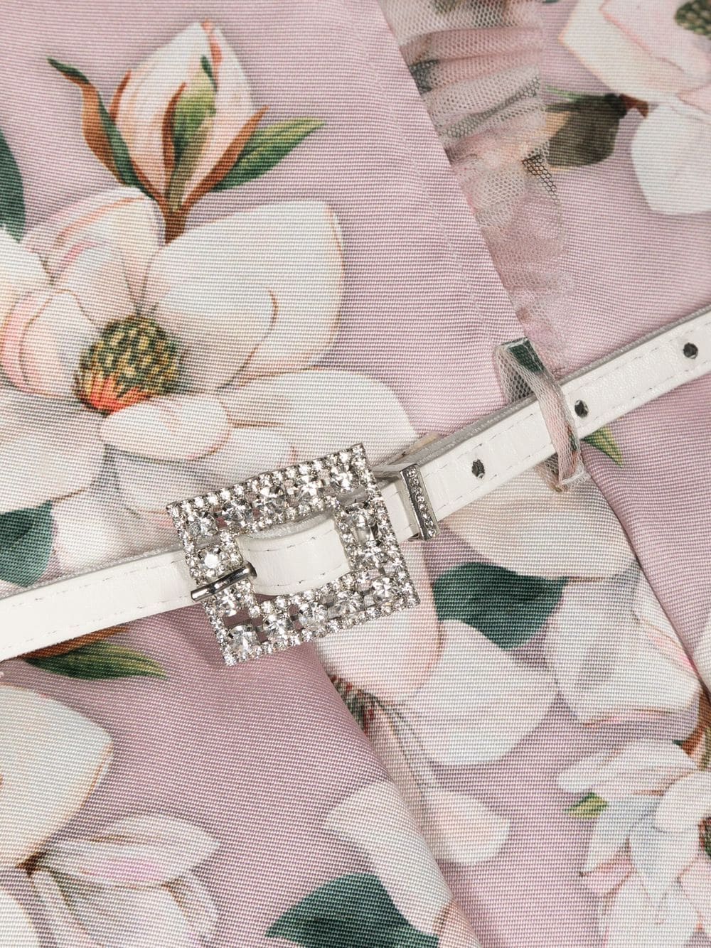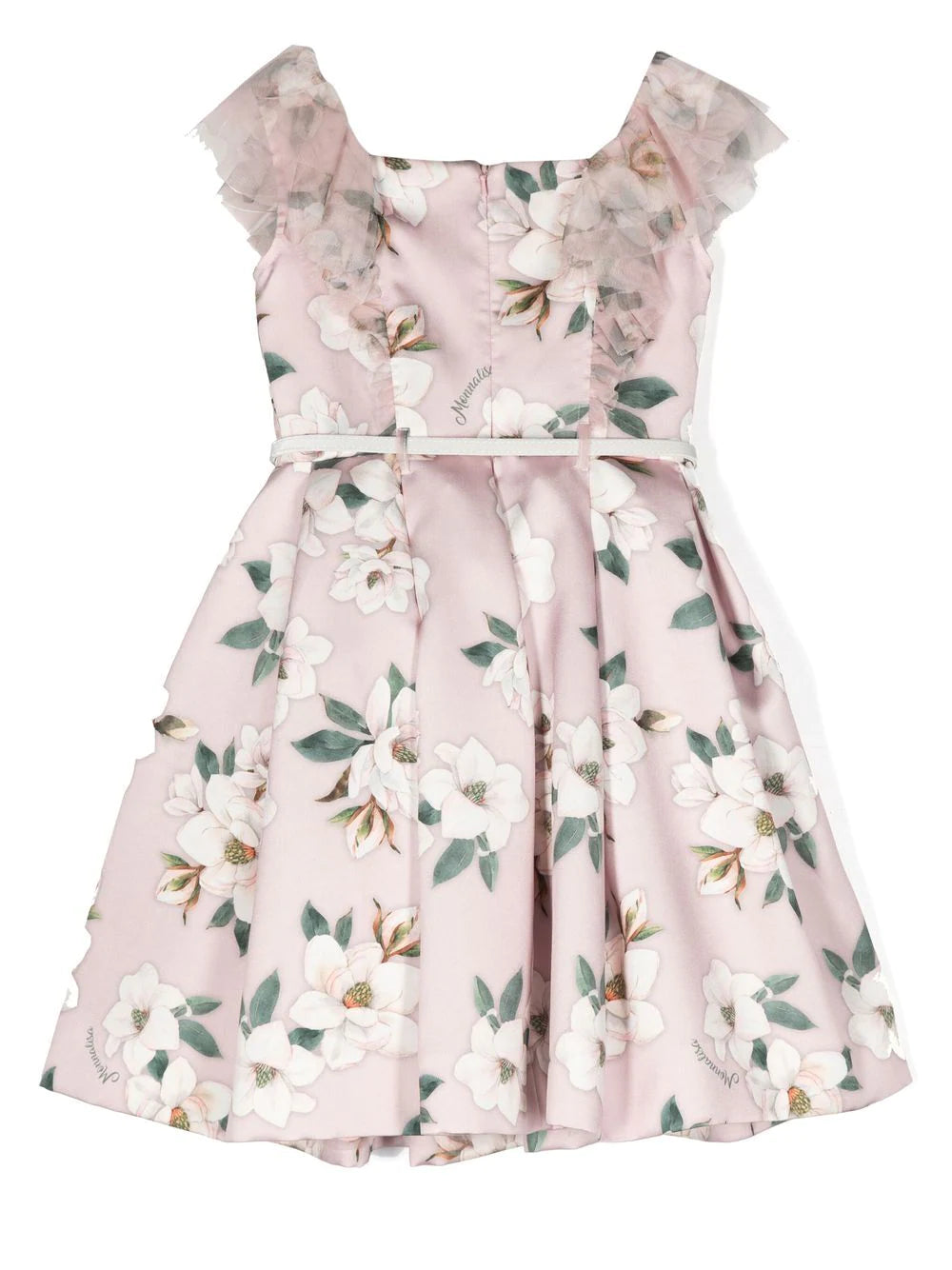 فستان ماركة موناليزا. فستان وردي فاتح، من القطن، بطبعات زهور، رقبة مربعة، أكمام بكرانيش، تفاصيل حزام، وتنورة بكسرات.