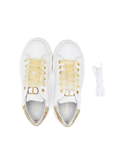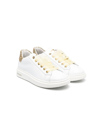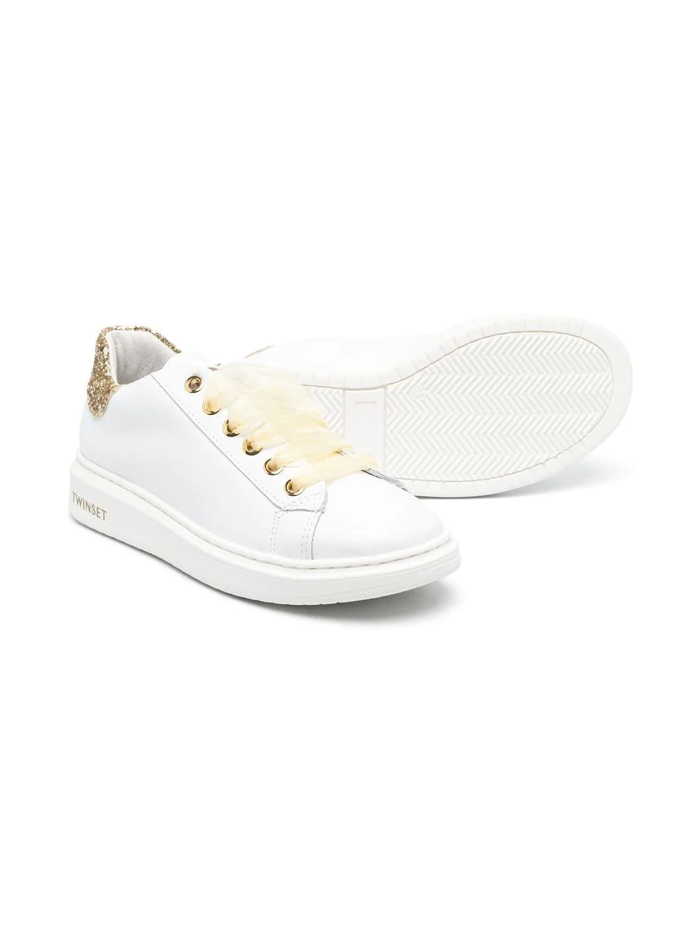 حذاء رياضي بأربطة وجليتر من ماركة TWINSET. لون أبيض بصري، جلد، تفاصيل لامعة، لسان مع شعار مطبوع، إغلاق برباط في الأمام، أربطة قابلة للتبديل، مقدمة مستديرة ونعل مطاطي مسطح. صنع في ايطاليا.