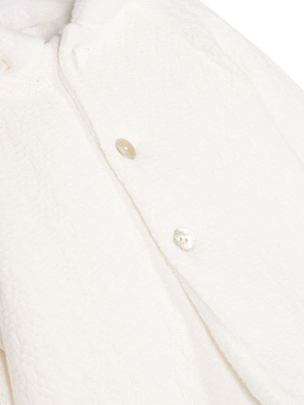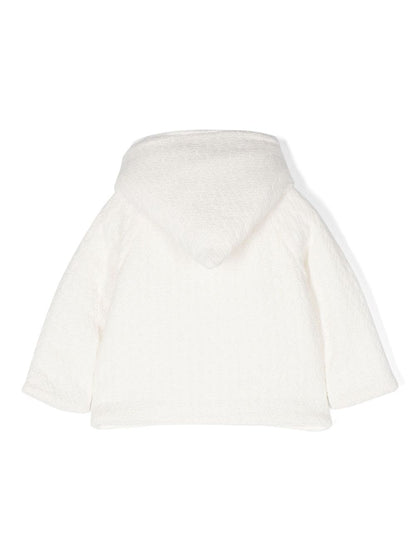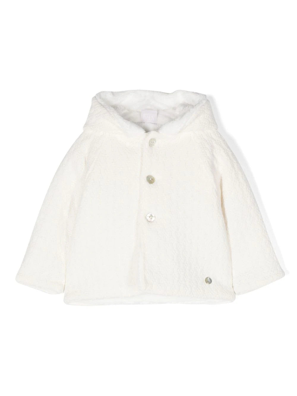 Paz Rodriguez brand hoodedcoat. White color, knit structure, front button closure, long sleeves and scalloped hem. Paz Rodriguez is a Spanish brand known worldwide for its luxurious baby and children's clothing collections with a delicate color palette and exquisite design. Paz Rodriguez offers a wide range of products made exclusively with high quality materials and care for the little ones.