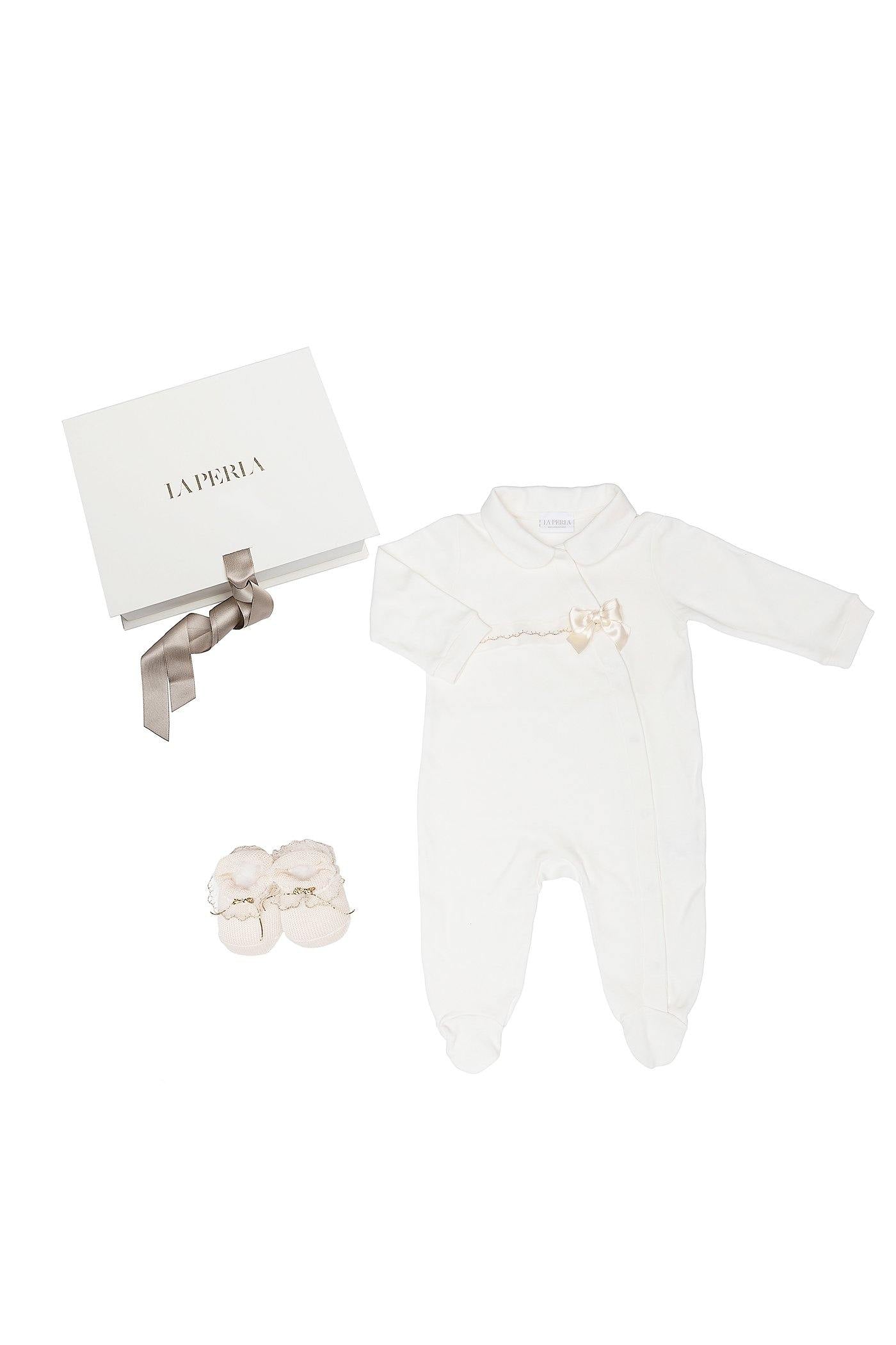 This bodysuit with long sleeves and legs in white color for baby girl will be the most comfortable garment for your little one for winter. It is made of cotton, made in a nice and soft knitted fabric. Adorable with its design, it is embellished with a bow in cream color and decorated on the front. This set goes with the slippers that also have the same decoration.