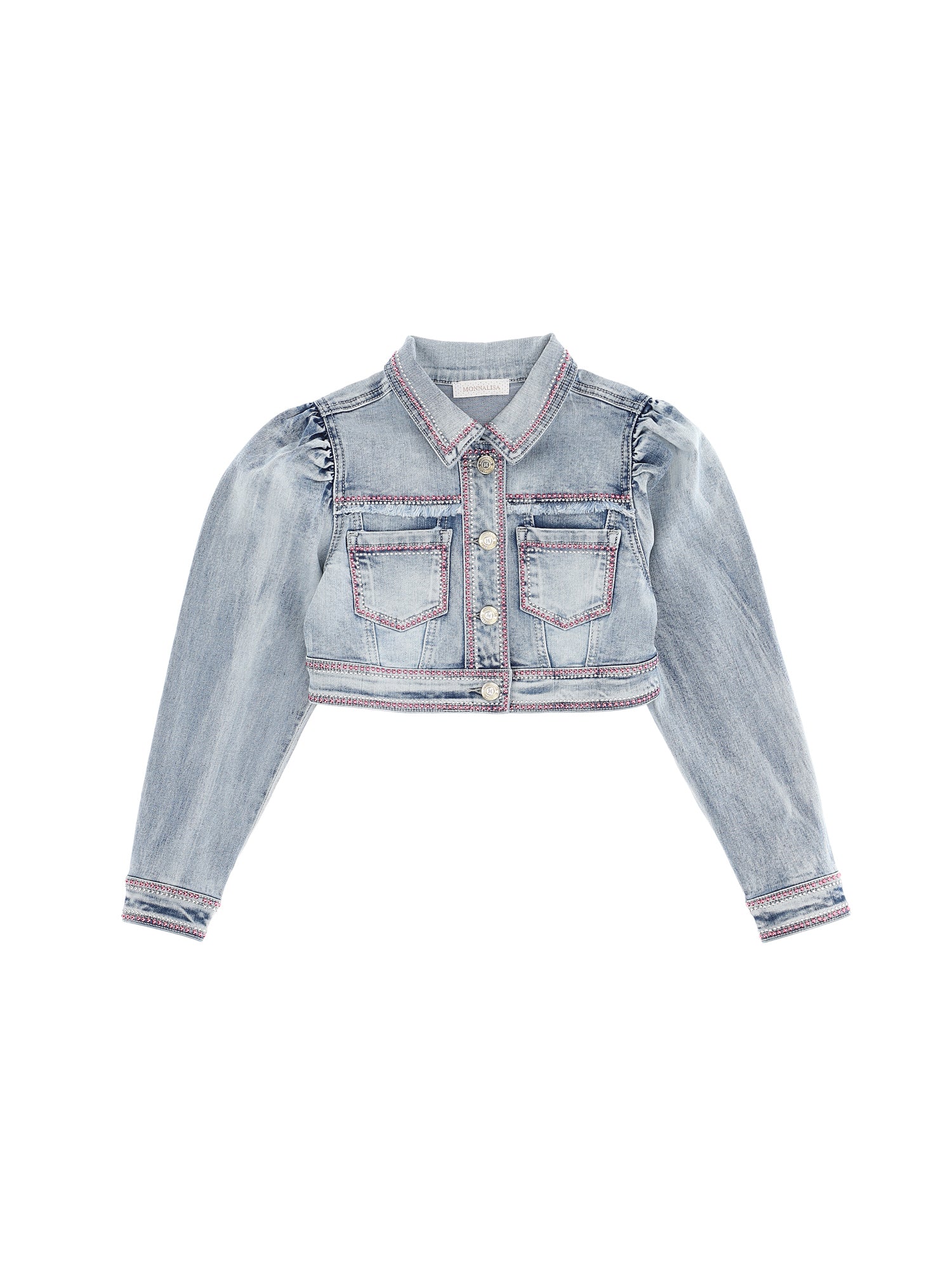 Denim jacket by MONNALISA. Garment with details. Crystal appliqué, classic collar, button closure on the front, long sleeves and two patch pockets on the chest.