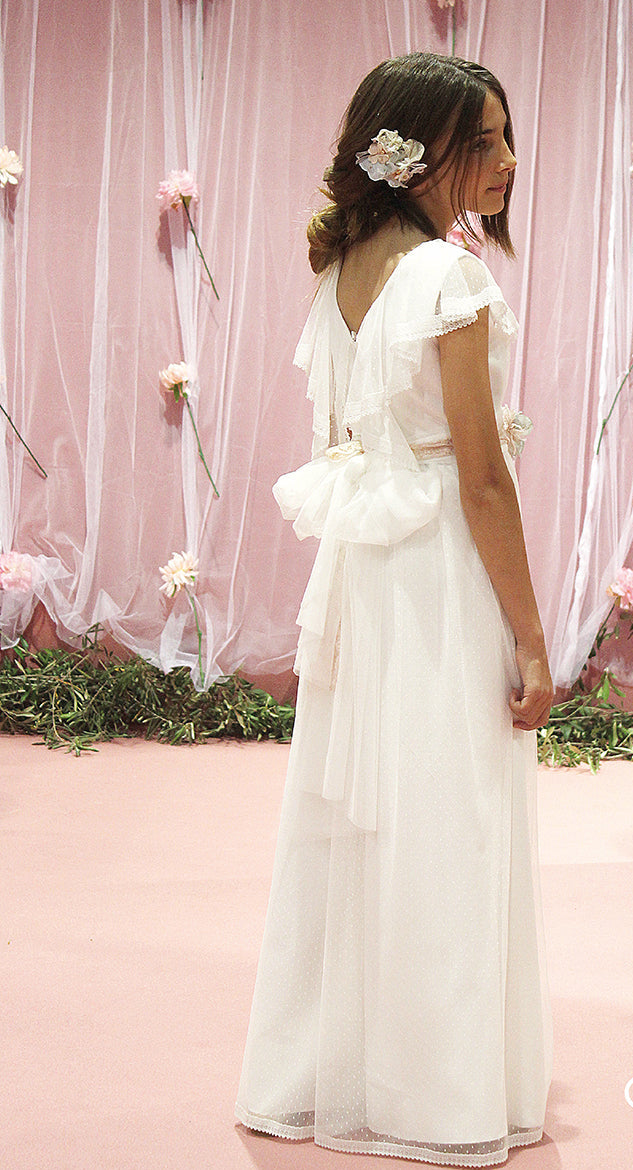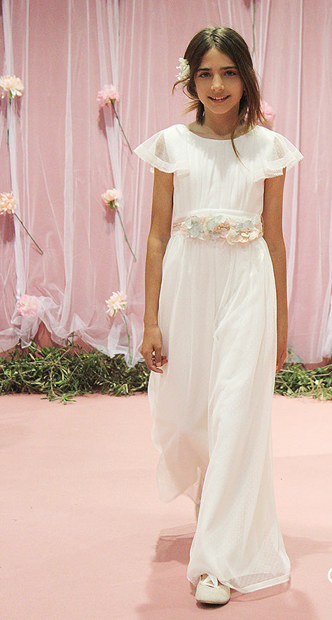 The communion set in white color for girl of the brand AMAYA. Short sleeve jumpsuit, round neck, pleated, plumetti tulle fabric in the romantic style, open back, with flower belt and hairpins in the same style. AMAYA always represents the romantic style characteristic of the firm, and as in every collection, a great commitment to innovation and craftsmanship of its accessories. The communion dresses come in any size and can even be made to measure.