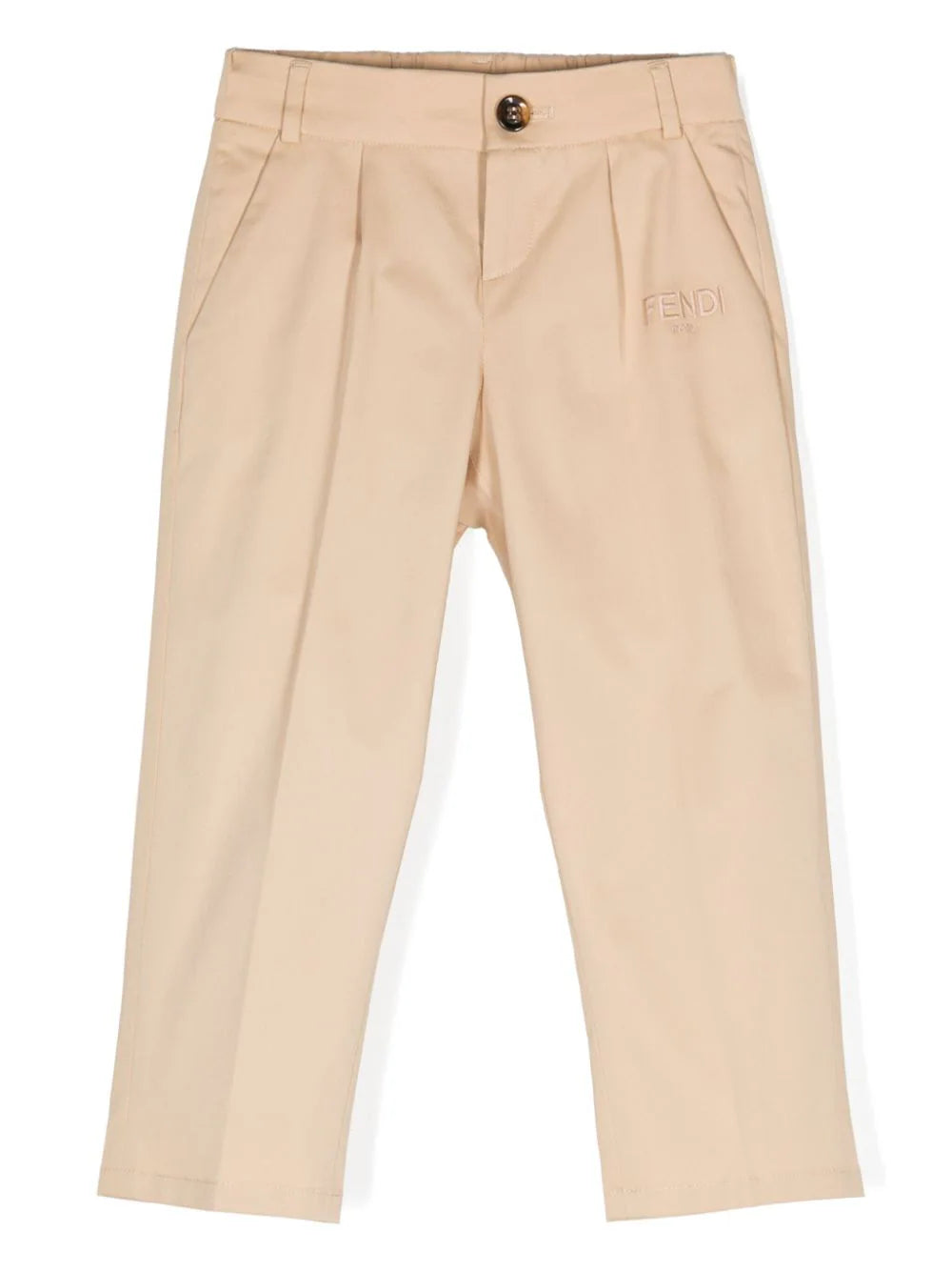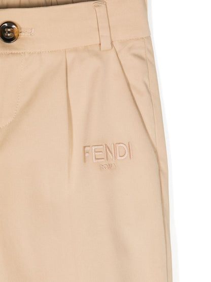 Pants straight beige of the brand Fendi Kids. Beige color,cotton, closure with button and concealed zipper, two side pockets, embroidered FENDI logo and straight hem. Fendi Kids has a recognizable brand print, popular all over the world. The children's collections repeat models for adults, combining luxury and comfort.