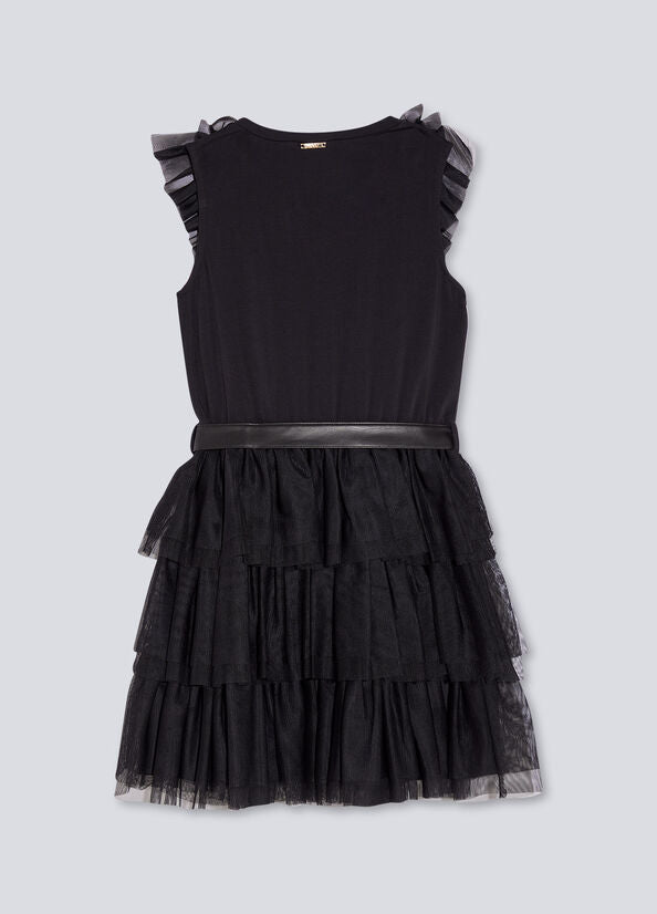 VESTIDO negro para niñas de la marca LIUJO. Prenda con detalles lleva la cinturon en la parte delantera, sin mangas, tiene la falda corta con volantes de tul de color negro. El vestido cómodo y sofisticado. Ideal para ocasiones en Primavera-Verano. Tela de especial calidad con un diseño informal.