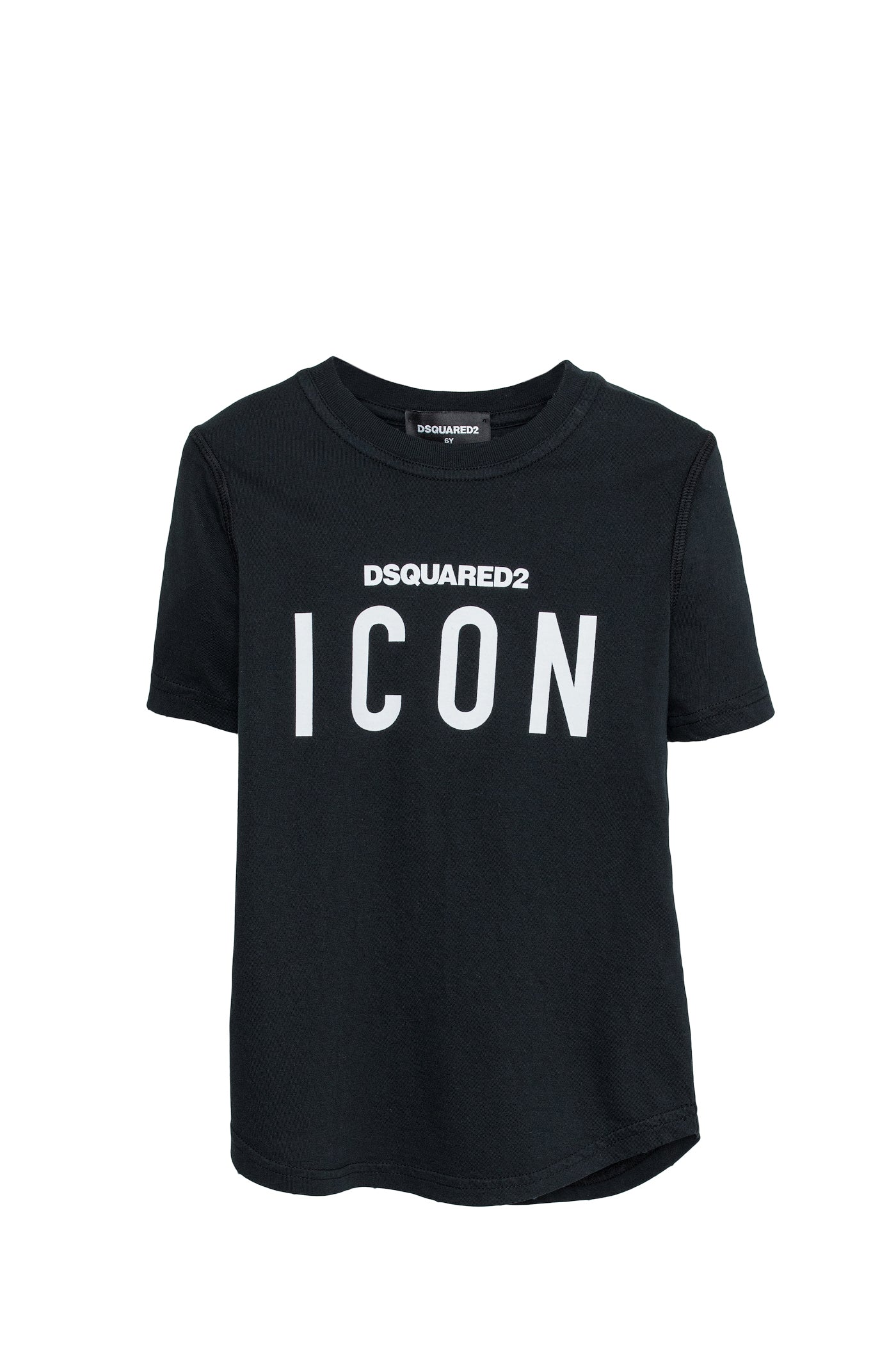 T-shirt of the brand Dsquared2. Garment with details, drawing of the logo in the center. Black short sleeve T-shirt, warm and sophisticated. Ideal for every day or other occasions. Special quality fabric with a casual-casual design. Only in black for children up to 14 years old. Dsquared2 T-shirt in cropped, slightly loose-fitting shapes, worn with seasonal style boots and sweatshirts printed with a graphic of a skier and the word Icon, which belongs to the brand's Icon collection.