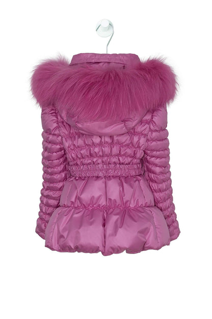 Curly jacket of the brand Canzitex. Garment with details, with natural fur hood, zipper in gold, feather filling, quilt and lining. Pink jacket with hood, comfortable and warm. Ideal for snow or rain in winter or special occasions. Special quality fabric with a casual-casual design. Only in pink for girls up to 6 years old. Canzitex curly jacket is a garment that uses high quality patented fabrics, natural quilt, exclusive and expensive accessories. It is a luxury for true appreciators!