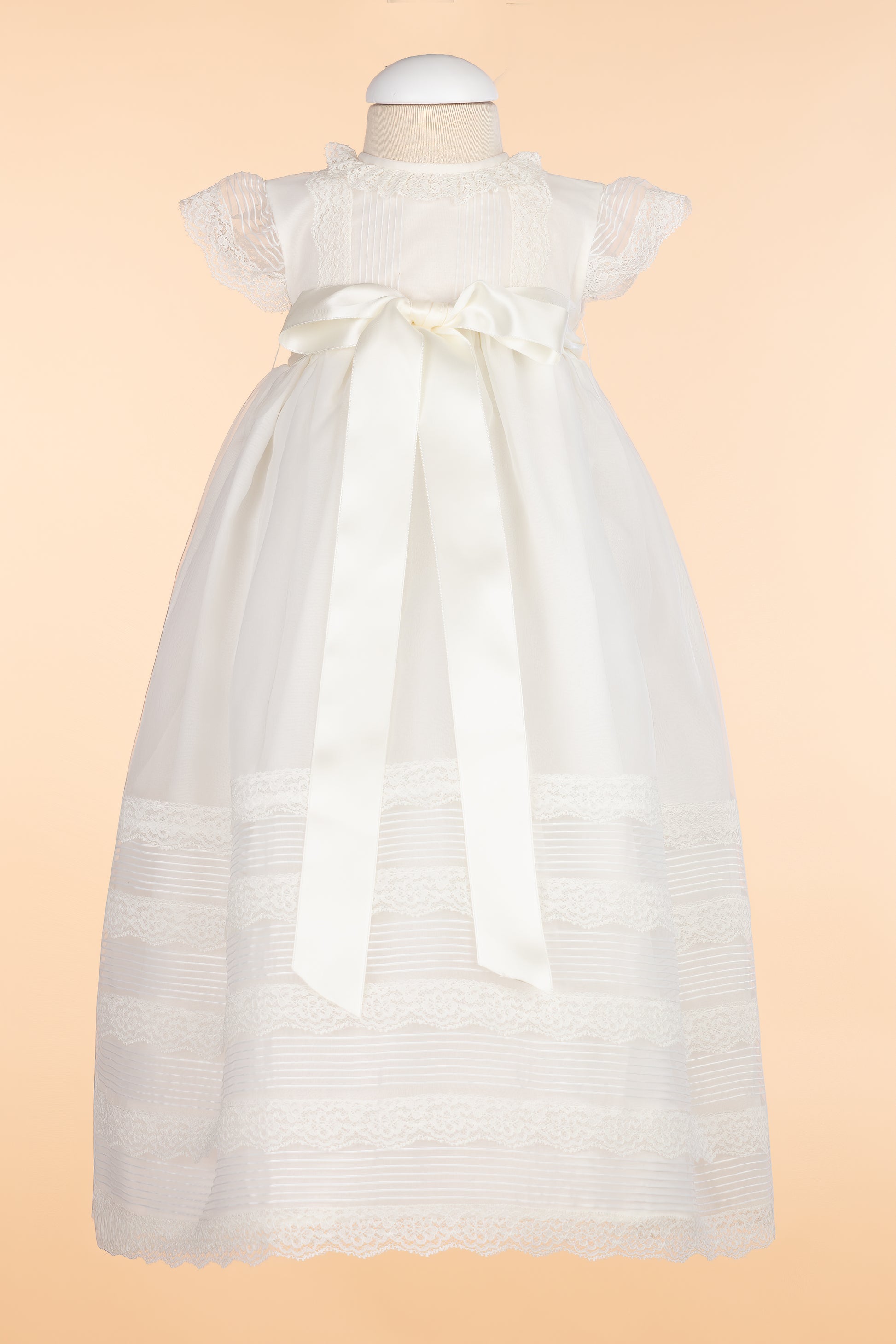 Faldon Fins in ecru color for christening of the Belan brand, short sleeve finished with ruffles. Faldon has silk ribbon and long skirt.