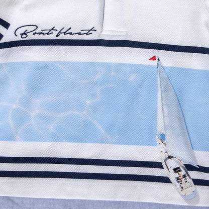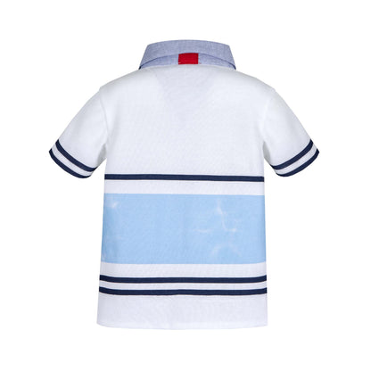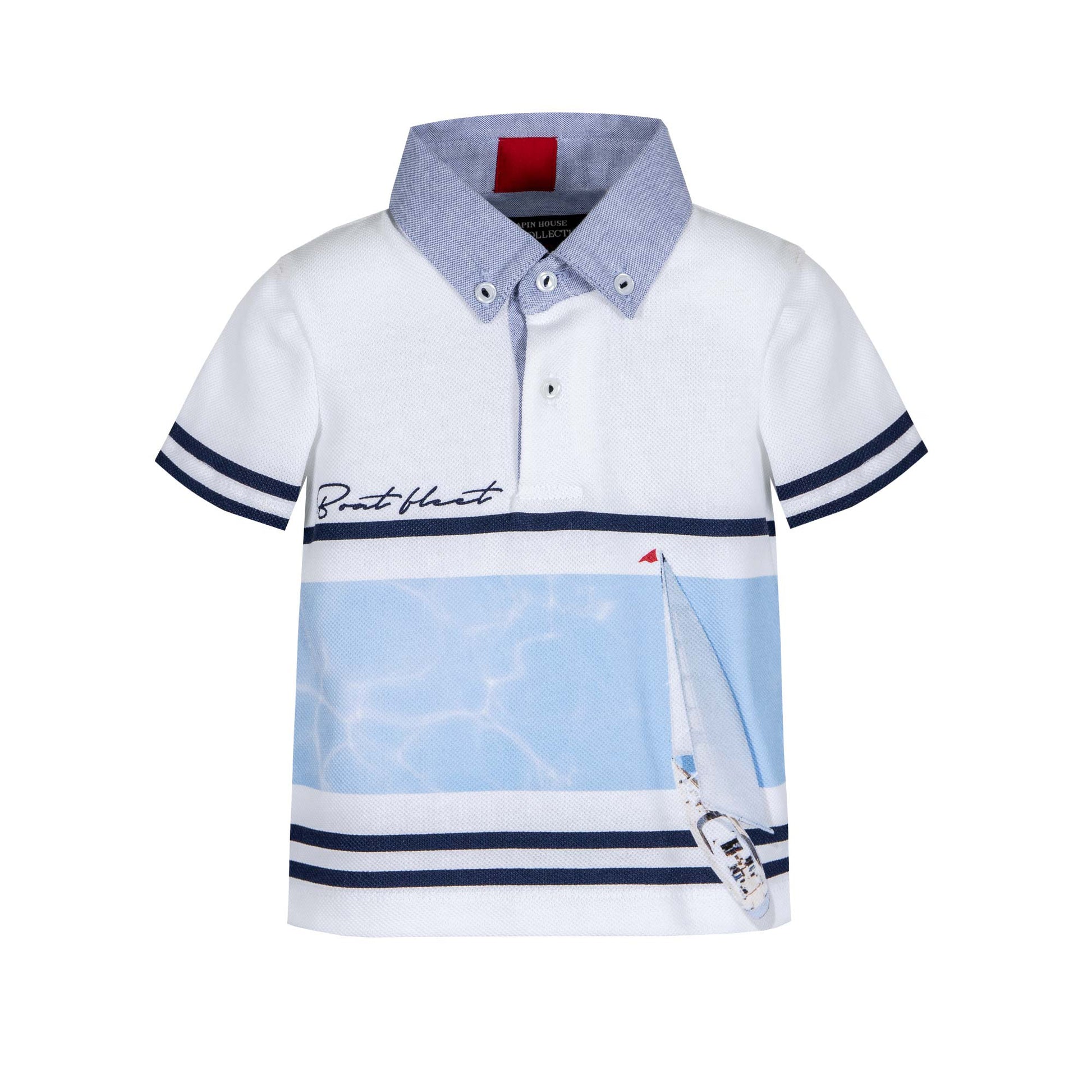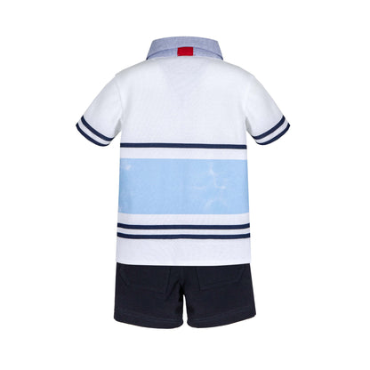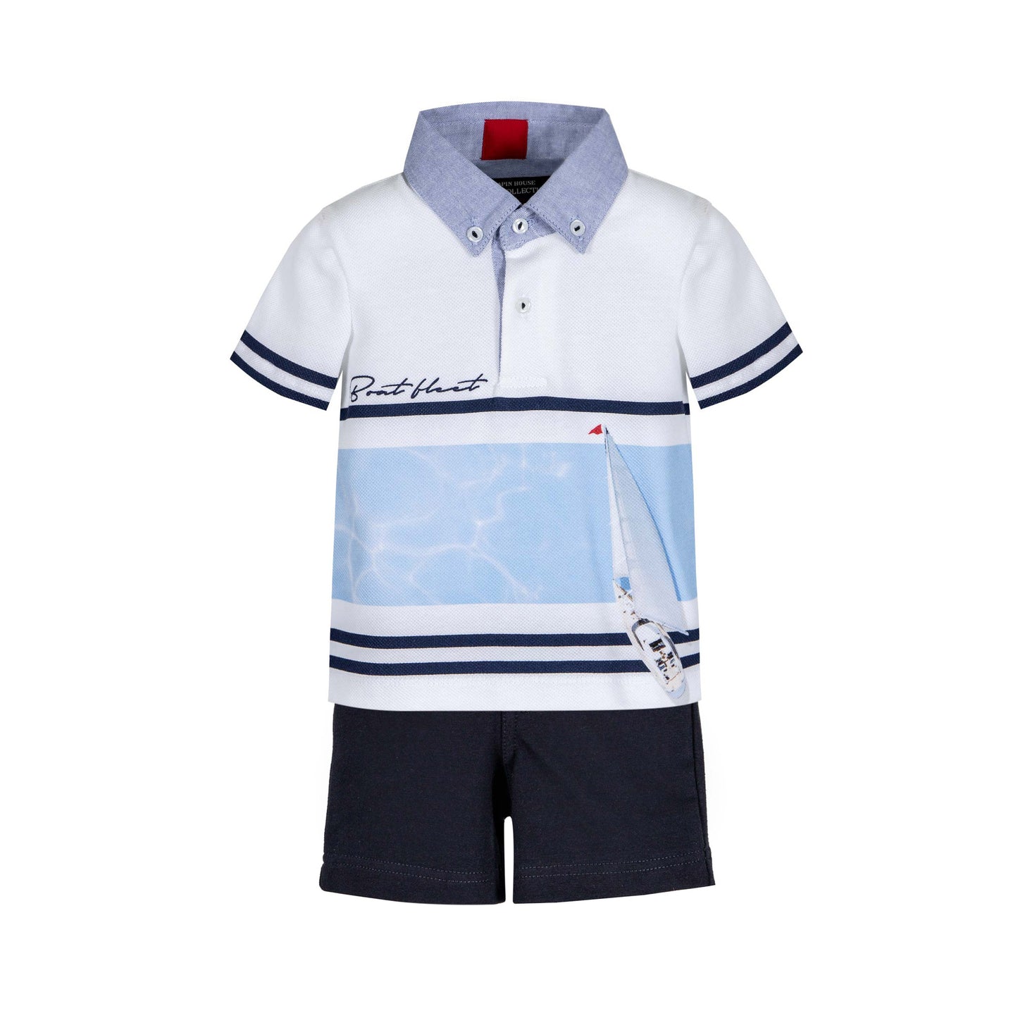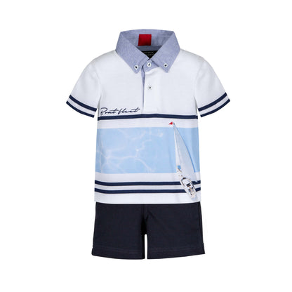 Complete set of the Lapin House brand. Garment with details, with the drawing of the boat on the front of the shirt. Complete set composed of white short sleeve t-shirt and navy blue shorts, comfortable and sophisticated. Ideal for special occasions in Spring-Summer. Special quality fabric with an elegant-formal design. Set of Lapin House brand , combination of sophisticated modesty, elegance and quality. The careful development of the patterns and the great attention to every detail make the clothes of this brand practical and comfortable.