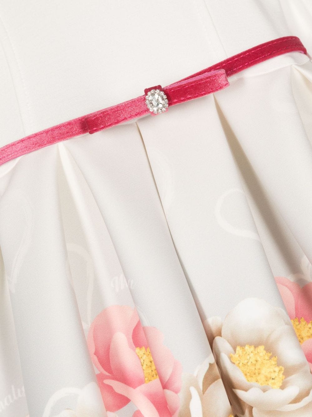 Dress with floral motif by MONNALISA. Off-white colour, multicoloured, belt detail, floral print, long sleeves, round neck and pleated skirt.