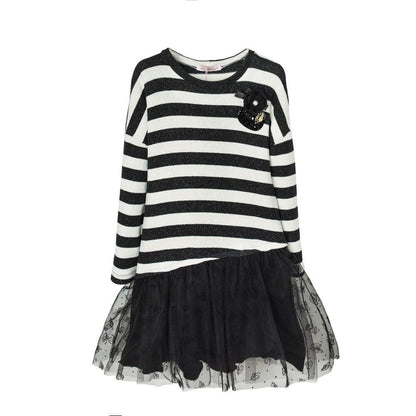 Black striped dress by Miss Blumarine. Garment with details, tull skirt and black pink on top. Combined dress in Glitter color stripes, for girl, comfortable and sophisticated. Ideal for autumn days or special occasions. Special quality fabric with a casual-casual design. Only in black stripes for girls up to 7 years old. Miss Blumarine Girls dress is a tender and poetic garment own brand, with mobility and style. The finishes are always functional and convenient. Designed and created to dress princesses.