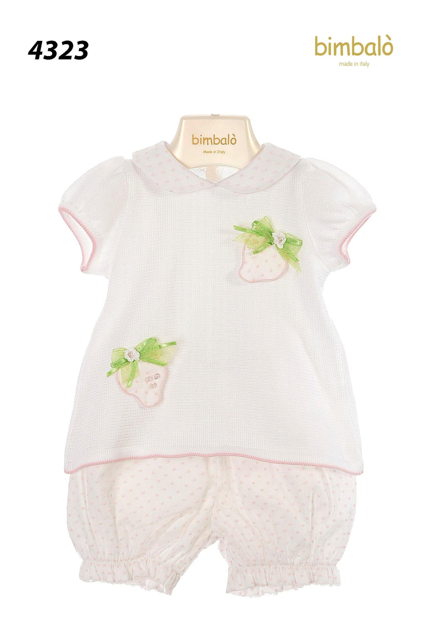 SET pants and t-shirt for baby girl in white color with sleeves and short legs of the brand Bimbalo. With button closure at the back. Special quality fabric with a design on the front - strawberries, elegant-formal design, will be the most comfortable garment for your daughter for summer.They are manufactured only from high quality in Italy, according to the exclusive creative concept of the brand.
