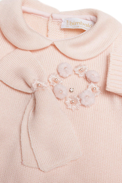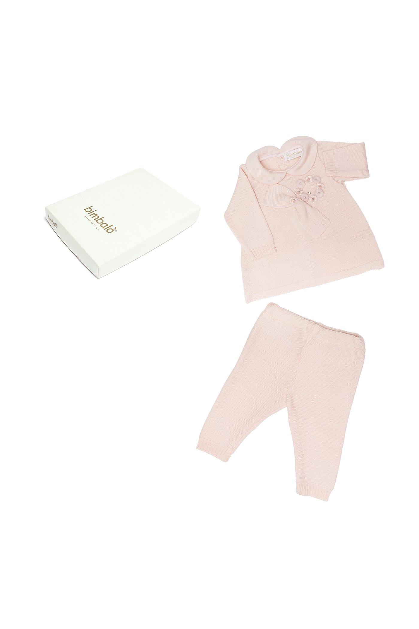 SET pants and wool sweater for baby girl in pink with long sleeves and legs of the brand Bimbalo. With button closure at the back. Special quality fabric with a design on the front - flowers and a bow, elegant-formal design, will be the most comfortable garment for your daughter for winter.It is manufactured only from high quality in Italy, according to the exclusive creative concept of the brand.