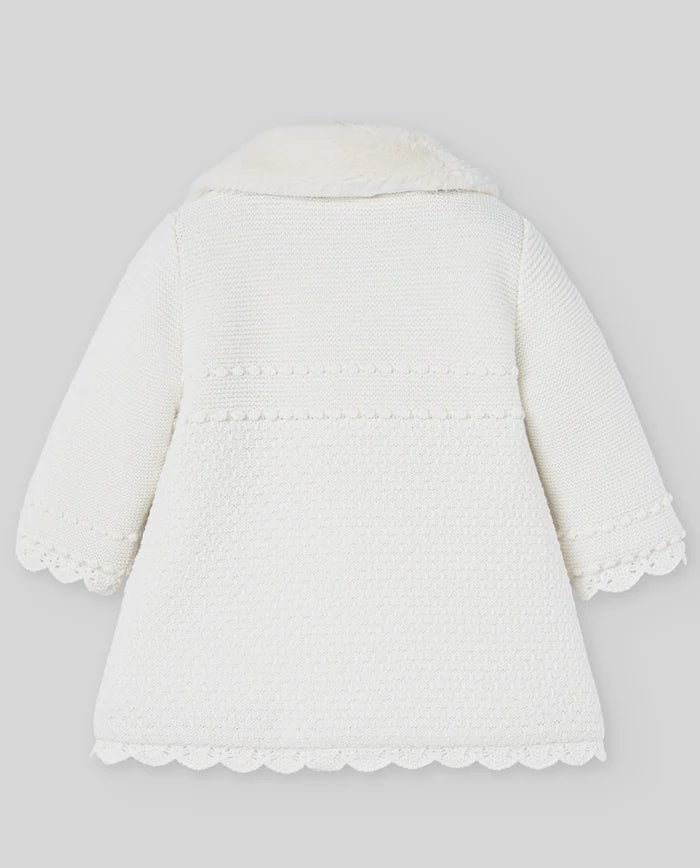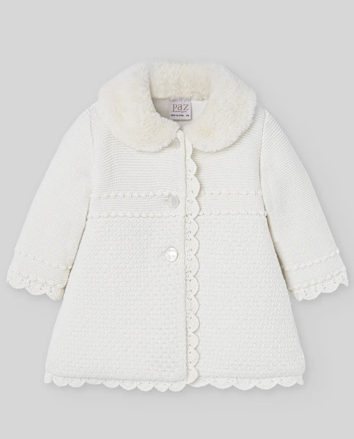 Abrigo de punto blanco de la marca Paz Rodriguez. Color blanco, estructura de punto, cierre con botones en la parte delantera, manga larga y dobladillo festoneado. Paz Rodríguez es una marca española mundialmente conocida por sus lujosas colecciones de ropa para bebés y niños con una delicada paleta de colores y un diseño exquisito. Paz Rodríguez ofrece una amplia gama de productos fabricados exclusivamente con materiales de alta calidad y cuidados para los más pequeños.